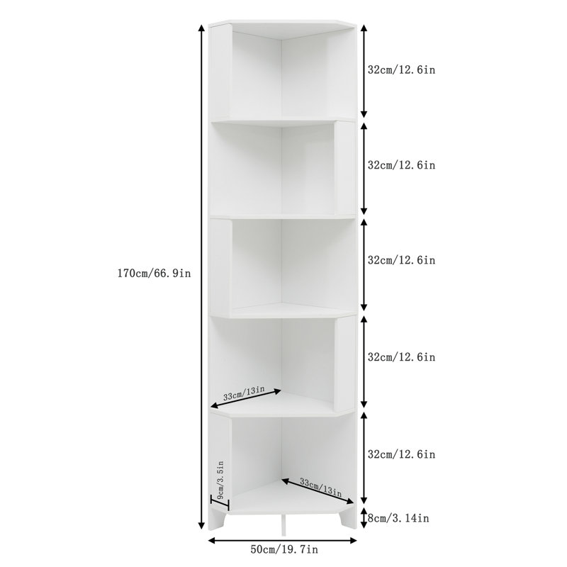 Freestanding Corner Storage Shelf: The shelf’s display dimensions are 13.5 x 13.5 x 66.9 inches. It weighs 32 pounds. This 5-tier corner bookshelf has a good amount of storage space, and a solid design and the style matches a lot of different furniture.