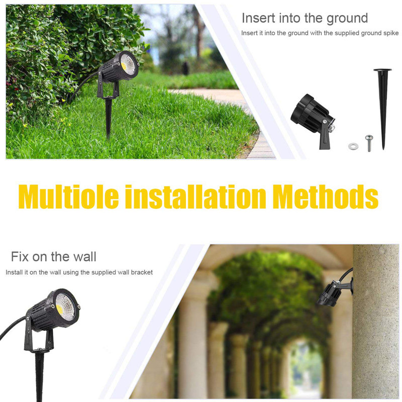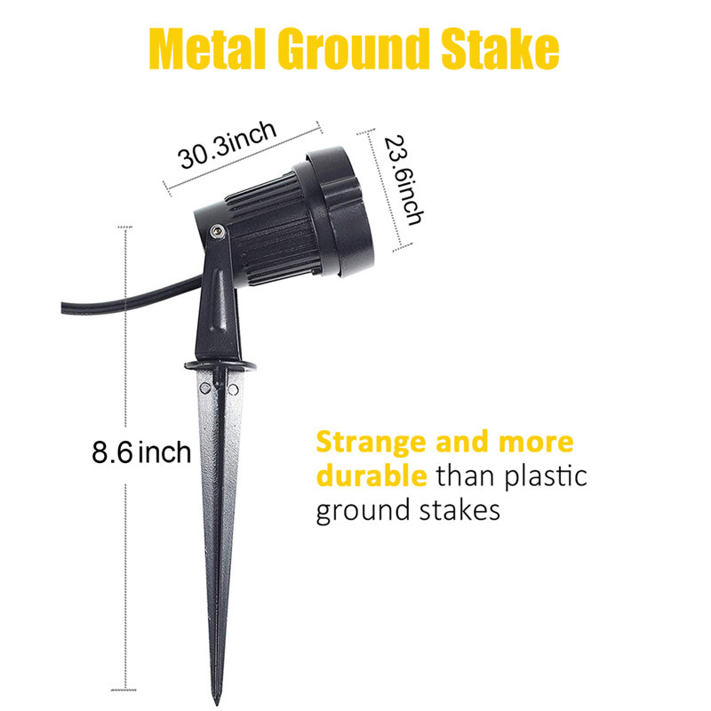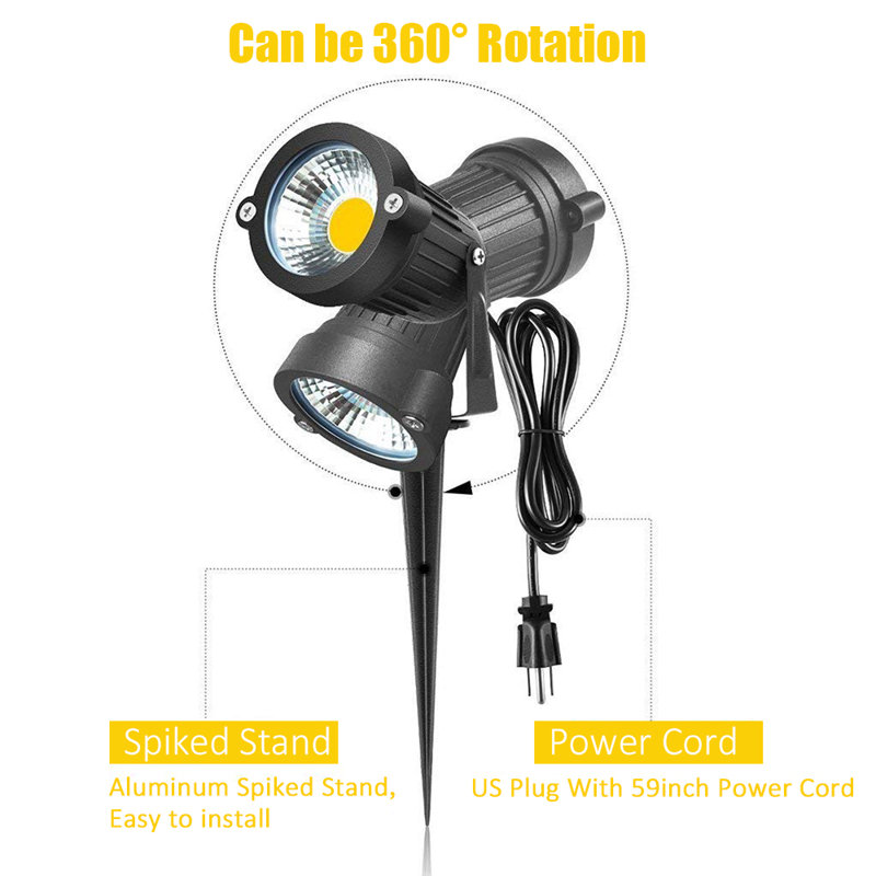 With a compact and weatherproof design, this hardwired/plug-in line voltage led spotlight is the perfect solution for your outdoor landscape lighting, ground mounted or wall mounted. Either use it for just the holiday season or a permanent setup with its 550 Lumens (30W halogen equivalent) output under only 5W power consumption, saves 70% on your electricity bill. It has a convenient spike design and a 59inch 3-prong US power cord for quick setup. This outdoor led spotlight provides 3000k warm white soft and comfortable lighting effect. Widely used for garden, yard, lawn, flags, park, patio, driveway, potted landscape, flower bed, etc.