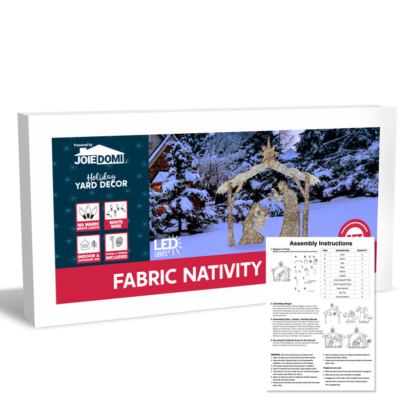 Our Christmas LED Yard Lights includes a 5 Feet Tall Nativity Scene with 160 LED Warm White Lights in Clear Wire, 4 Metal Stakes, and Zip Ties. Made of Metal Frame and Glitter Fabric.