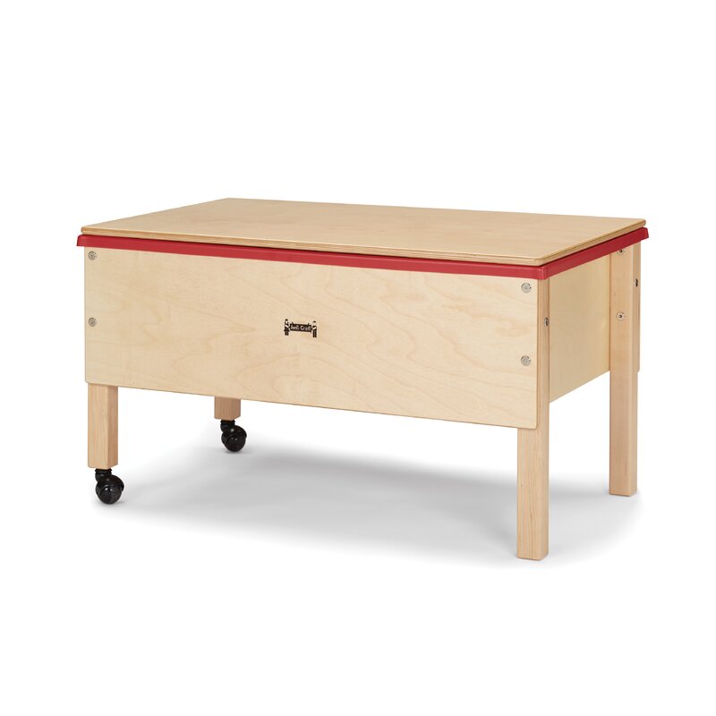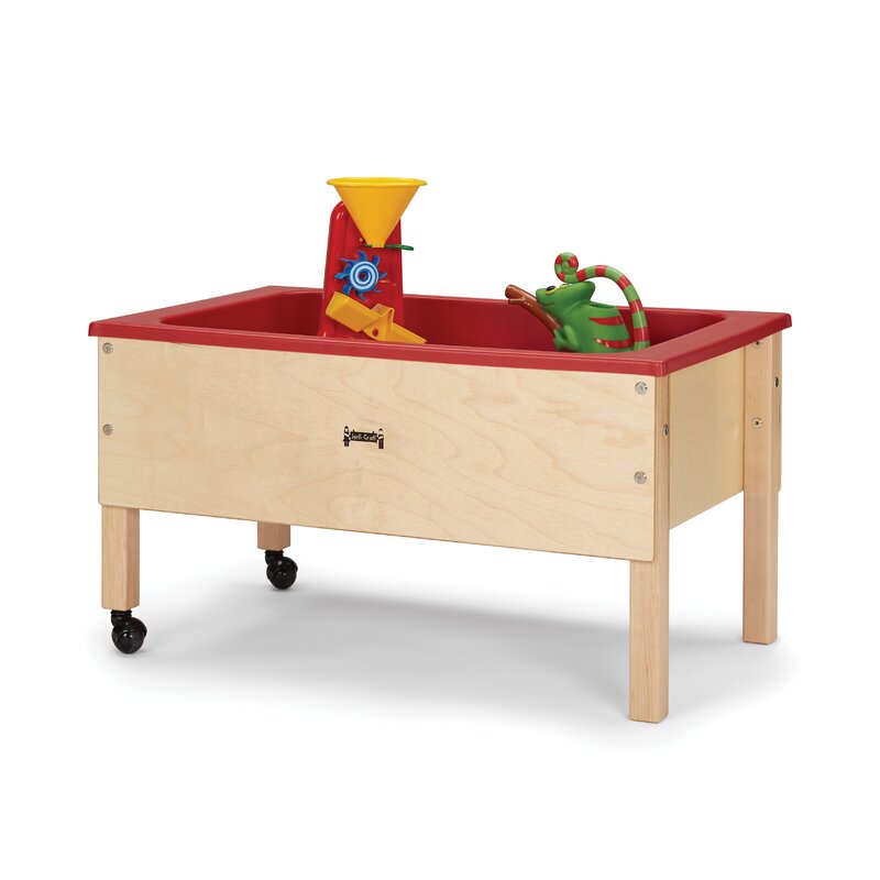 A sand-n-water table at a toddler’s height with a deeper table for splash control. The high-pressure laminate top ensures easy cleanup.