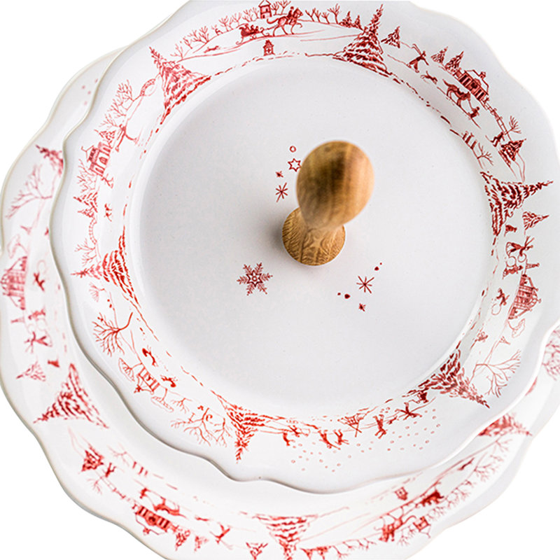 Festive winter games on the Country Estate and a sprinkling of painterly snowflakes festoon the ruffled rim of this two-tiered server. With a beautifully sculpted oiled-oak handle for easy carrying of irresistible holiday treats and nibbles that you will delight in using year after year.