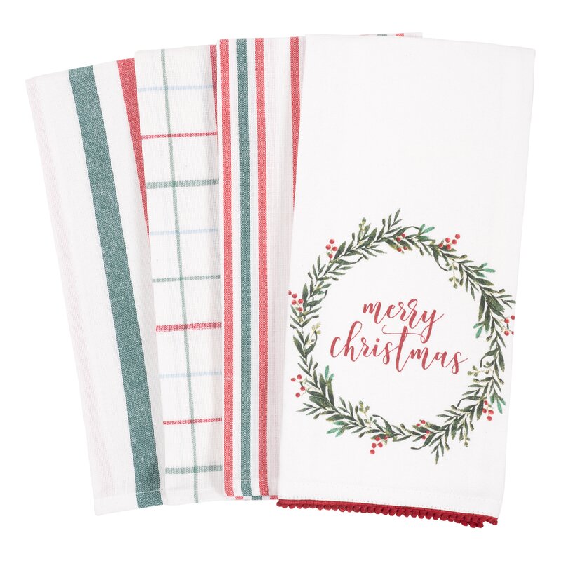 Set of 4 includes: Merry Christmas wreathe print towel and 3 yarn-dyed towels as shown in the image.