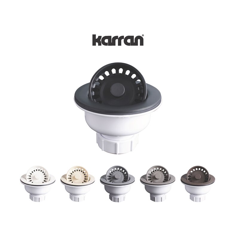 Color-matched sink basket strainer designed to match Karran quartz sinks.