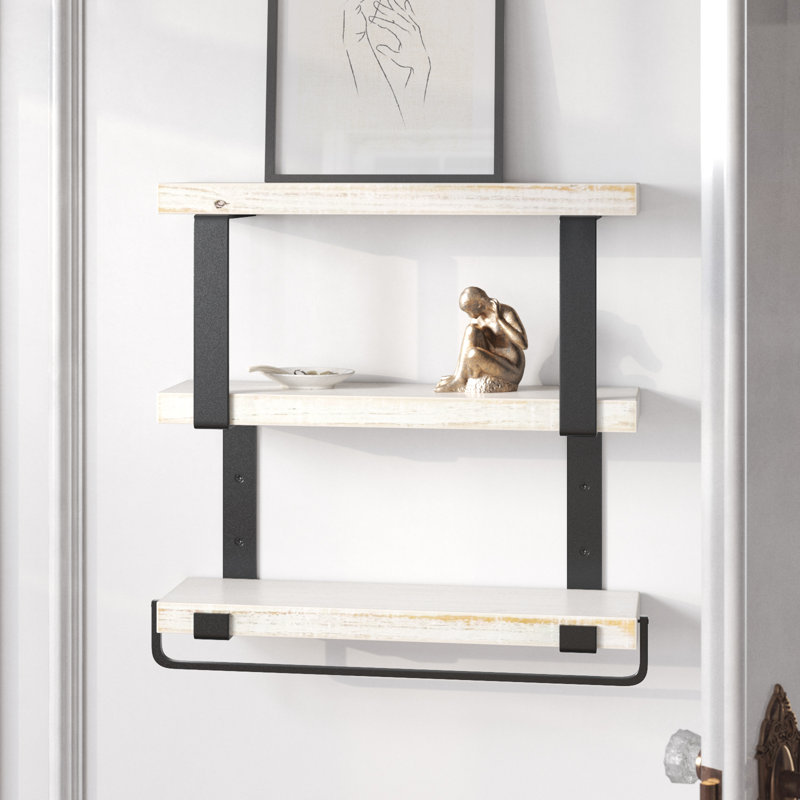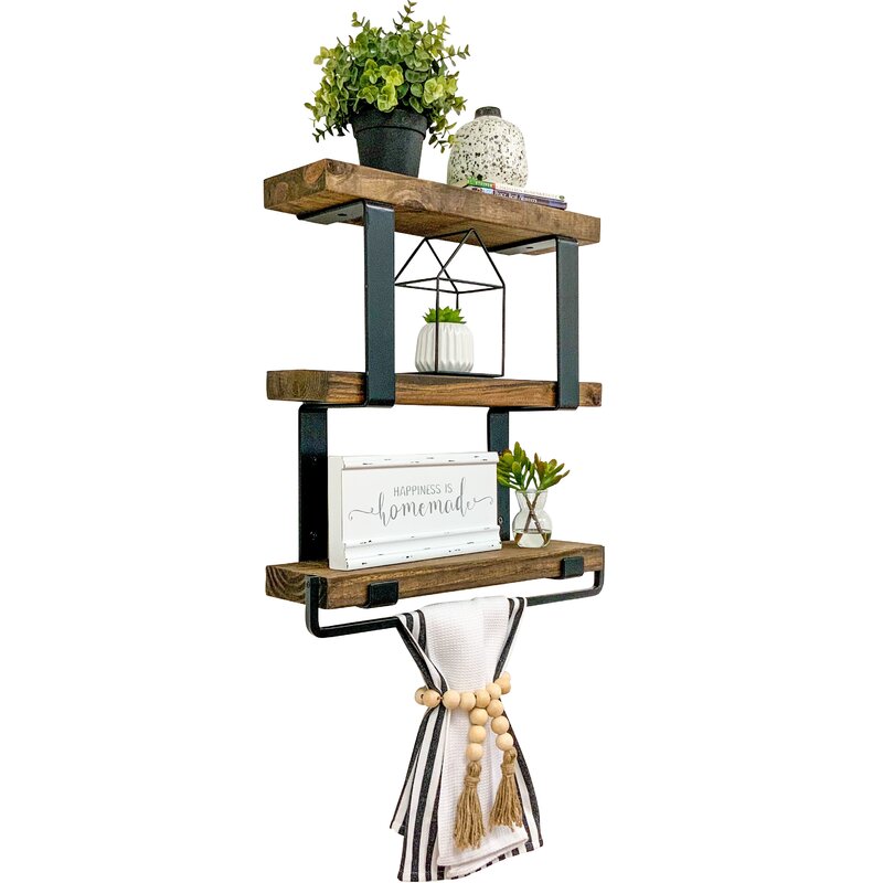 This tiered wall shelf is bound to look just right on any wall, from the living room to the bedroom. It showcases an open, three-tiered design that’s crafted with three solid wood shelves in a neutral hue, and it’s held in place by black metal brackets that are sure to complement your French country or traditional decor. The shelves measure 6.1″ in diameter, so you have enough space to display a few small framed photos, candles, or your favorite trinkets. Plus, this piece has a black-finished towel bar, so it’s ideal for hanging up washcloths or hand towels in your powder room. Hand-curated by Kelly Clarkson.