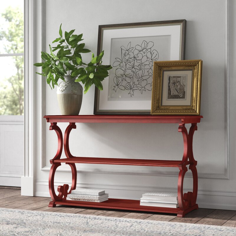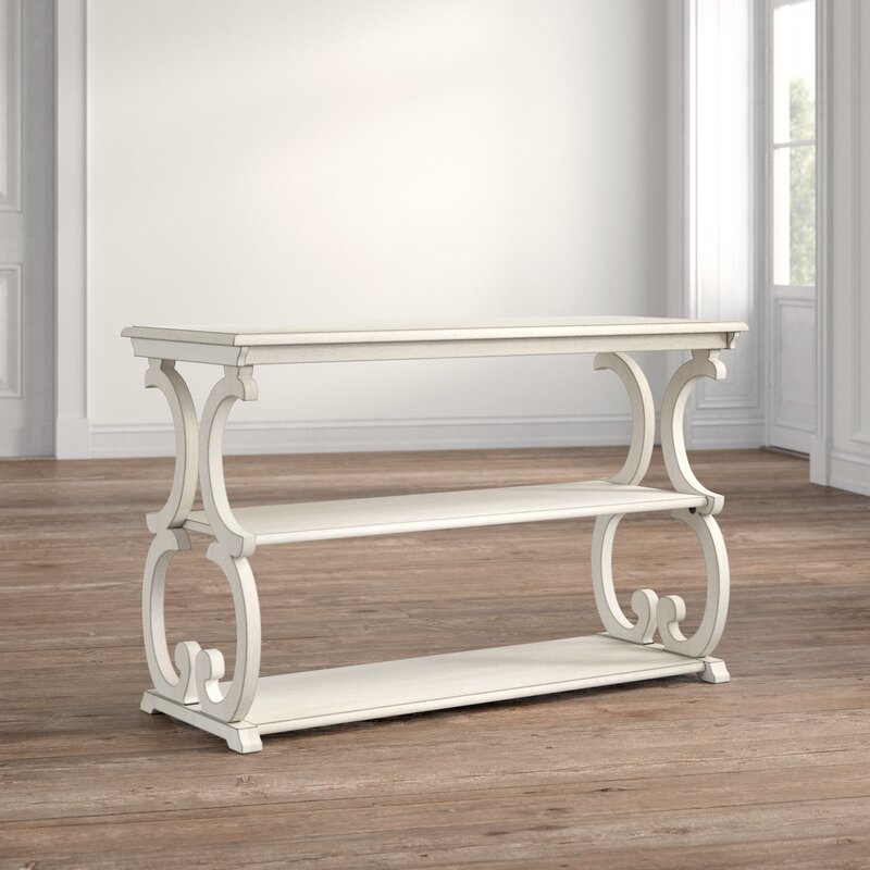 Purchased Antique White.Excellent packaging (see photo), and looks exactly as pictured.Had a tiny chip on back side of console but Wayfair took care of that and I’m thrilled.Took forever to find something “just right”.Took about an hour to assemble (I’m so-so at self-assembly, so many people will be far faster at this). Included a close up so you can see the edge and how it looks just the right amount (as in barely) distressed and not just painted.Shown with Wayfair rug “Darcia Pink/Purple Area Rug” and “Abigail Standard Bookcase” in “Chalked Chestnut”.All three products – the Noisettier Console Table, rug and bookcases are incredibly high quality.Have had close friend see how the colors really go together and lighten the room.Can’t explain how happy I am with the purchase.Elegant without being too “country frenchy” or prissy or feminine.Adds just the right amount of style without being in your face.This piece (and the others!) will most definitely be around a long time.After countless attempts to find the right TV/Entertainment Center I couldn’t find one.A friend said “look at console tables – they’re slender! And they don’t have the ‘entertainment’ (ugh, so bland!) feel about them…!”Spot on.And at this price…! Wow.Sorry for the slightly messy pix of the cable cords and cat on towel – I’m working on what I’ll put on the shelves and hide the cable box.Buy it! So much better than an “entertainment center” — I just needed something that wasn’t super deep and with the flat-screen that’s all I needed.Still have room for a cat to lay out in front of the TV without blocking the TV!Thanks always to Wayfair and customer service input as well.