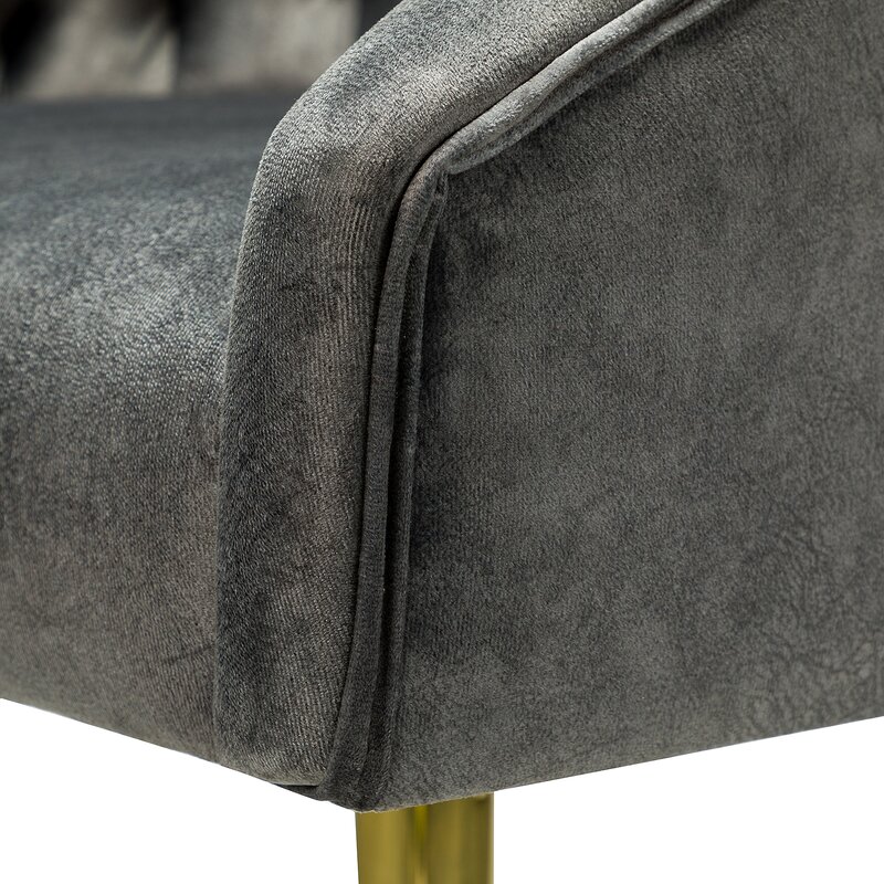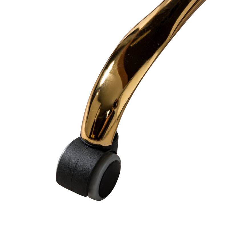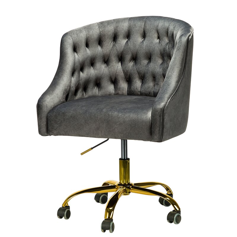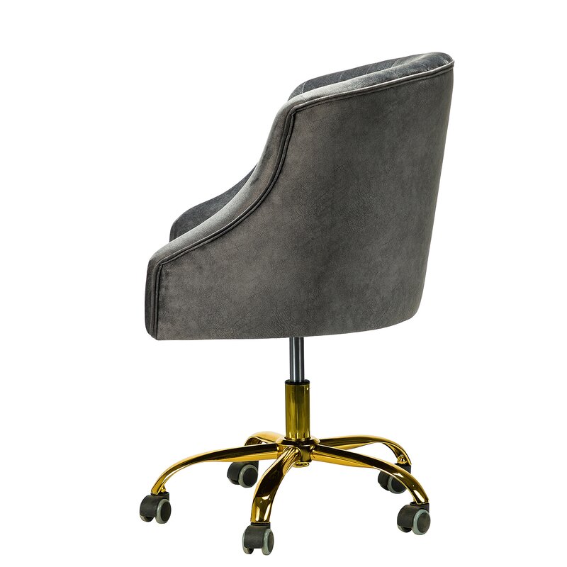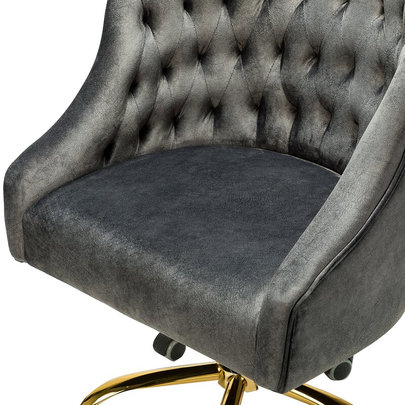 This isn’t your standard office chair! It showcases a modified wingback design with a rounded back and sloped, recessed arms for a distinctive look. Button-tufted details dot the back for a bit of texture. This ergonomic office chair is upholstered with velvet in a solid hue for a glam touch to any style — from modern to French country. Down below, it features gold-finished metal legs and five casters that allow smooth movement across your carpet or hardwood floor. It’s also seat height adjustable with a swivel function that helps you move from task to task with ease.