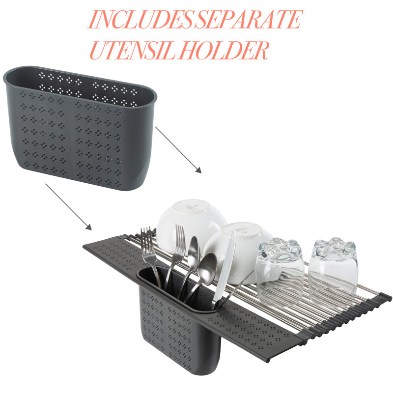 The ultimate space saver is found in this Kitchen Details over the sink drying rack. When doing dishes you can easily dry using the roll out drying rack by simply placing over your sink or next to it on the kitchen countertop. Designed with a separate utensil holder and the easy to store roll up function. Durable construction and BPA Free makes this a great addition to your kitchen!