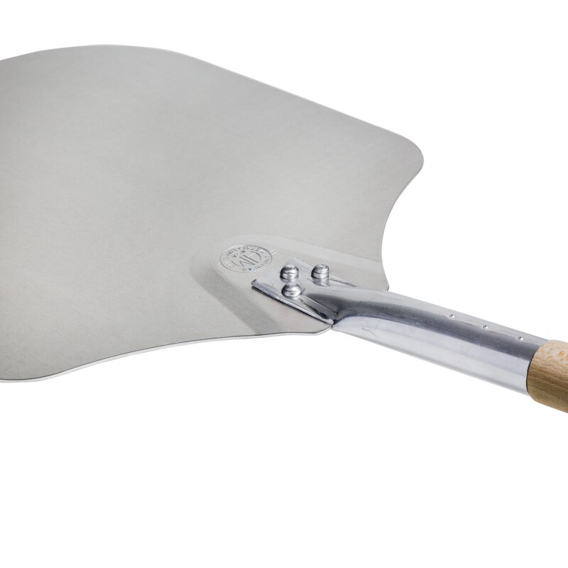 Pizza peels are used to transfer dough recipes such as pizza, bread, and pastries into and out of an oven. This peel is made with a flat metal carrying surface attached to a wood handle extending from one side to allow for easy maneuvering into the oven.