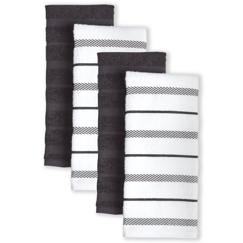 Get your kitchen chores done in classic style with the stripe kitchen towel 4-piece set. The set includes two solid kitchen towels and two colored and white striped towels. The solid towel is made with highly-absorbent cotton and works well for wiping splatters and spills, cleaning countertops, and drying dishes since it is non-abrasive and safe for use on most kitchen surfaces. The striped kitchen towel is made with a cotton-polyester blend for durability and versatility use while tidying up. These soft kitchen towels are perfect for everyday use, including daily household chores. Perfect for drying and cleaning glassware, cookware, flatware, and more. While not being used, these multi-purpose kitchen towels can be used as placemats or displayed in your kitchen on hooks or on your appliances as decorative kitchen accessories. Place these kitchen towels in your kitchen, bathroom, laundry room, or work area. New kitchen towel sets make the perfect gift for a housewarming or hostess gift. Easy clean machine washable. It is made in India.