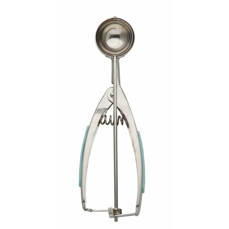 This ice cream scoop easily scoops uniform balls of cookie dough. The body is made of stainless steel with easy-squeeze soft-grip handles.