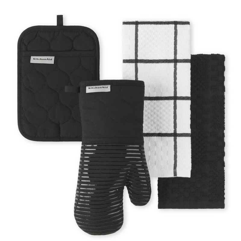 This set of Kitchen aid items are a great addition to the kitchen, the 2 towels are made of strong material and have a great texture. The oven mitt and pot holder are a solid color and have silicone gripping so that oven item will not slip out of your hands and will not burn you.