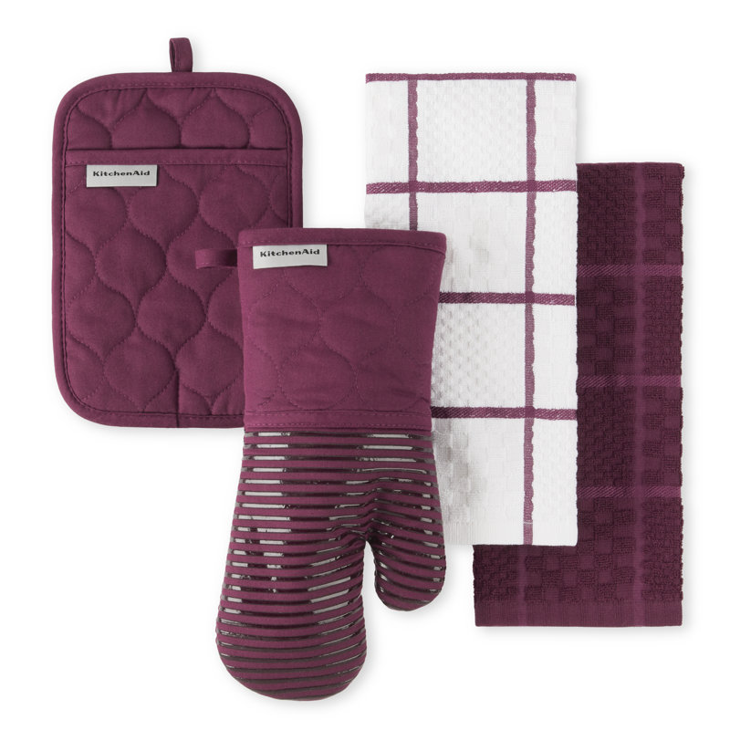 Get kitchen tasks done with the help of the KitchenAid Onion Quilt 4-Pack in Beet. This set includes two terry dobby kitchen towels, a pot holder, and an oven mitt, all with a combination of a modern solid and trellis design. The oven mitt and pot holder offer heat protection while handling hot pots, pans, dishes, and cookware. The kitchen towels are soft and absorbent. This set is machine washable for easy care.