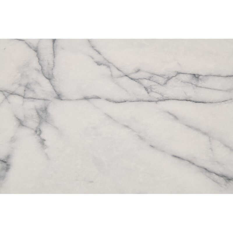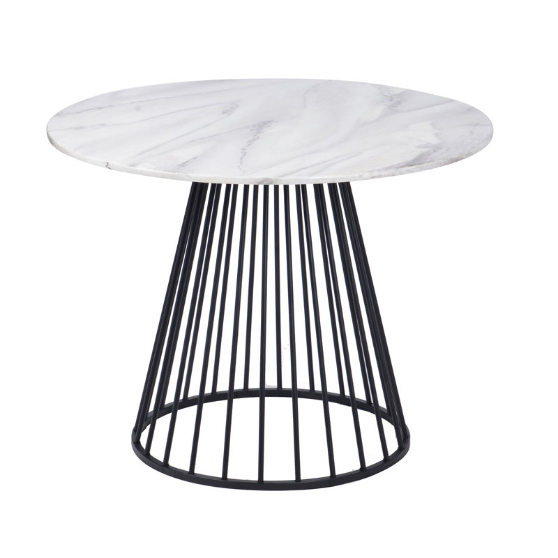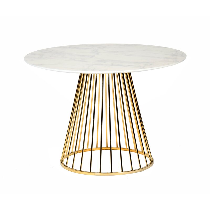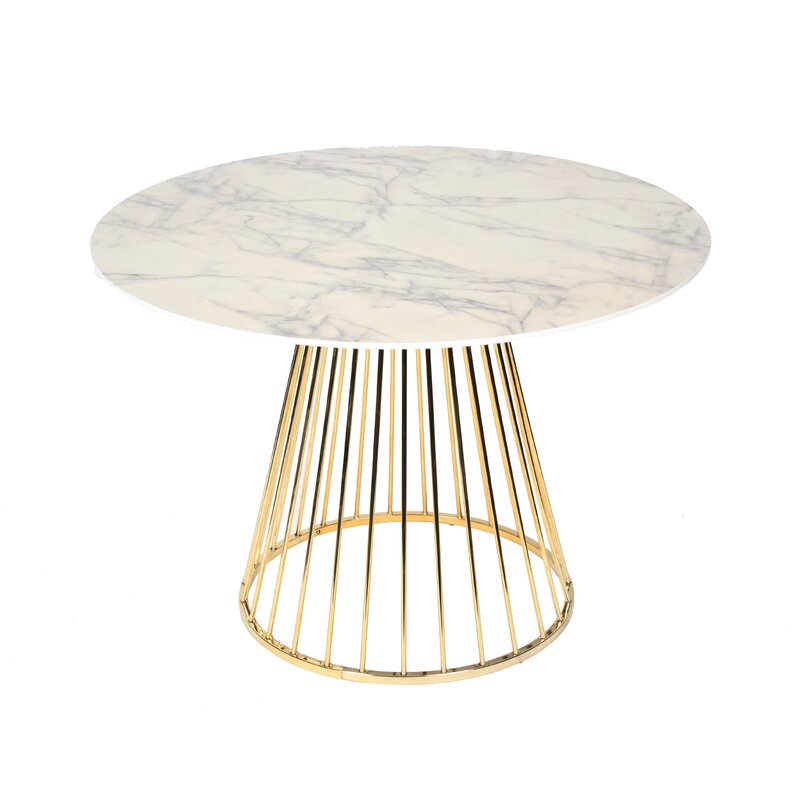 This dining table adds a modern silhouette and a mix of glam materials to your dining room or eat-in kitchen. It’s crafted from a blend of engineered wood and stainless steel, and it showcases a shiny finish that’s sure to make a style statement in your home. This table is built on a pedestal base with a cage-style design for an open look. The circular tabletop is crafted from faux marble with veining for an elegant look that’s easy to clean. Plus, this dining table measures 30″ tall by 43″ wide, so it’s ideal for seating up to four people.