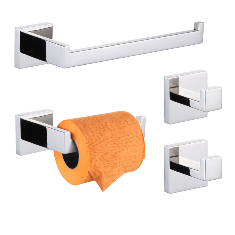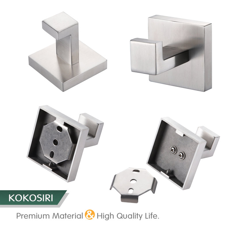 Package Content: Robe hook x 2; Toilet paper holder x 1; Towel holder x 1. All mounting hardware and instructions are included in the package. If you meet any problem during installation or there is any part missing, please remember to contact KOKOSIRI.