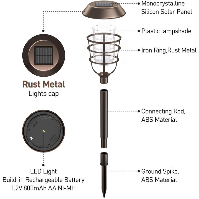 Dusk to Dawn Light-up All Night – The lights outdoor are waterproof and use thickened, corrosion-resistant materials that are more durable and rust-free than cheap solar garden lights. Premium solar panel and higher capacity rechargeable battery means our solar outdoor lights can effectively absorb more sunlight and converts it into electricity. Charging for 4-6 hours in the sun can continuously glow for 6-8 hours, which greatly meets your needs for brightness effect and lighting duration.