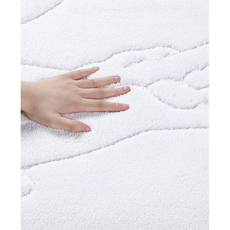 This rug is soft, pretty, and stays in place.It is a nice comfortable fabric on the toes.The rug washes nicely – wrinkle free and ready for use.The pattern is subtle – make it a fun accent to a bathing area.