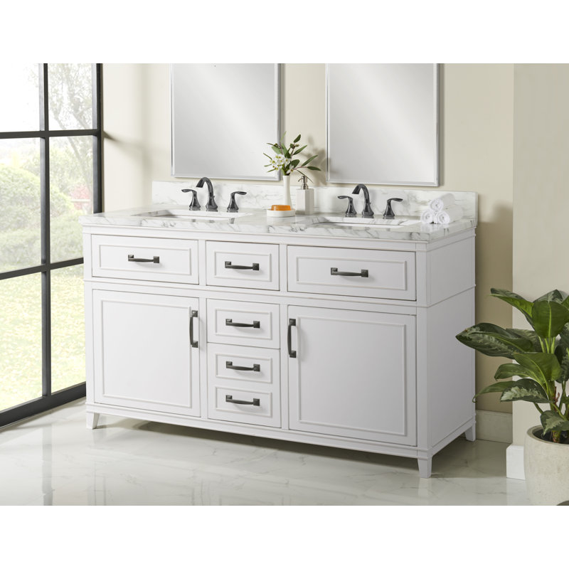 Bring a classic style to your bathroom with this double vanity. Crafted from sturdy engineered wood and finished in antique white, this piece features two nicely sized cabinets with adjustable shelves, three drawers, and two top tilt-down drawers for plenty of storage space. The white and gray cultured marble countertop adds a subtle touch of elegance, while the 4″ backsplash provides an additional detail. Antique pewter-finished handles on the doors and drawers add a touch of rustic charm. It comes with sink and cabinet handles; drain assembly, faucet, mirror, backsplash, and P-Trap, and mounting bracket sold separately.