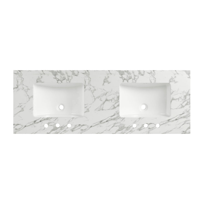 Solid white and gray 1″ thick cultured marble top features pre-drilled 8″ spread for a faucet (faucet not included); Matching 4″ high backsplash included
