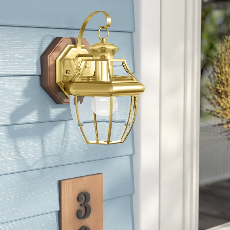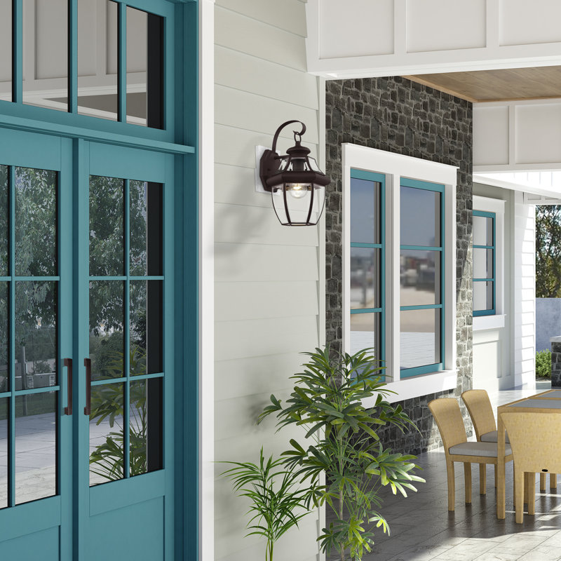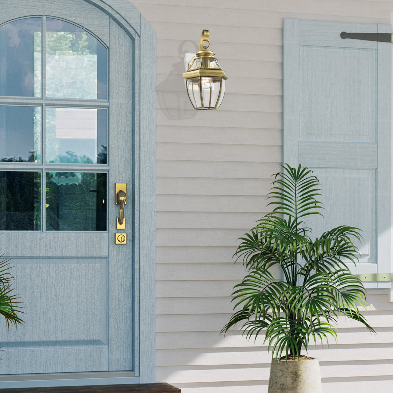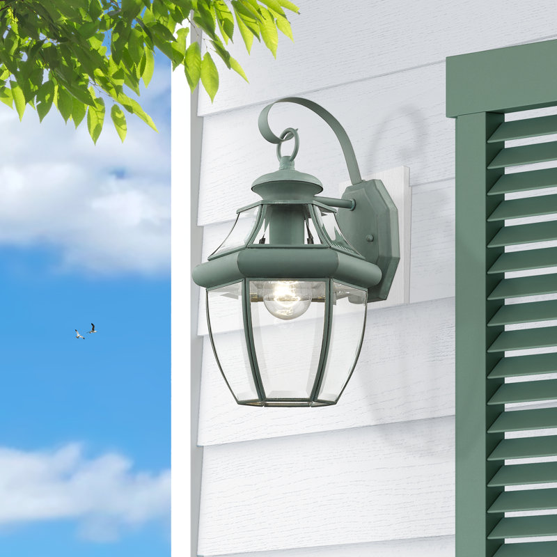 Inspired by colonial gas lanterns flanking the doors of meetinghouses and taverns in sleepy New England villages, and lighting the entryways of clapboard-clad homes lining winding cobblestone streets, this traditional one-light outdoor wall lantern wears its heritage with pride. This delightful design showcases a raised octagonal backplate, a scrollwork shepherd’s hook arm, and a simple one-bulb fixture enveloped in clear, beveled glass panels. Establish a timeless, inviting aesthetic on your front porch by setting a planked-top accent table between a pair of spindle-back rocking chairs. Install one of these lights on each side of the front door to illuminate the scene in a soft glow, then sit back with your better half and sip on a mug of hot coffee while enjoying the breeze.