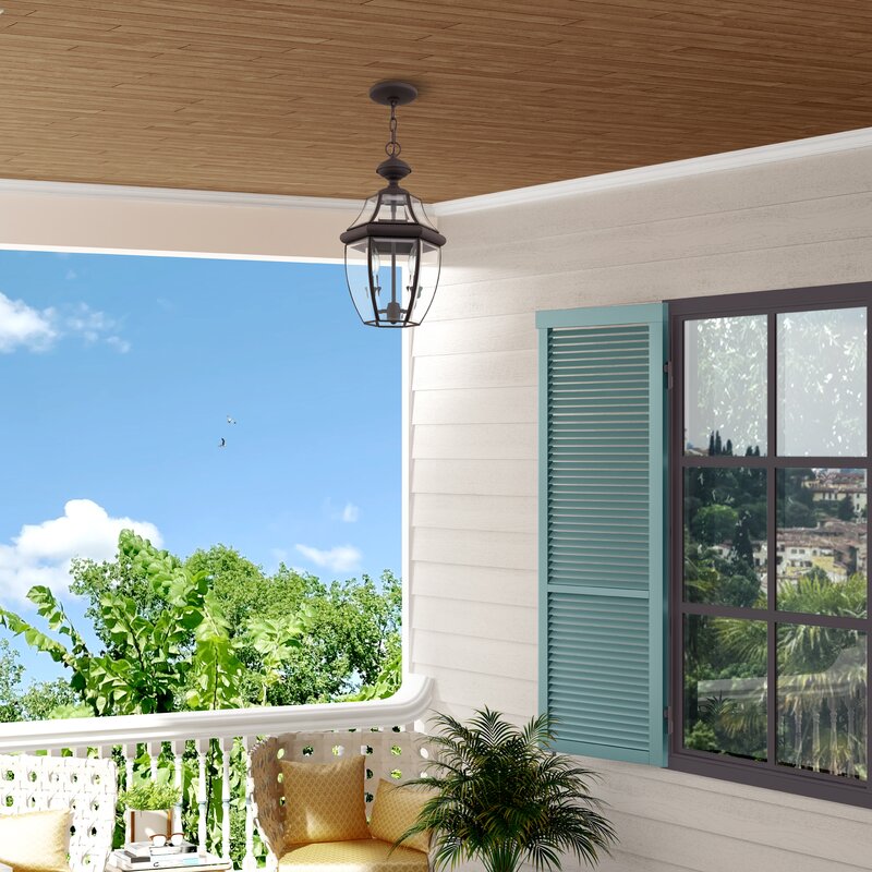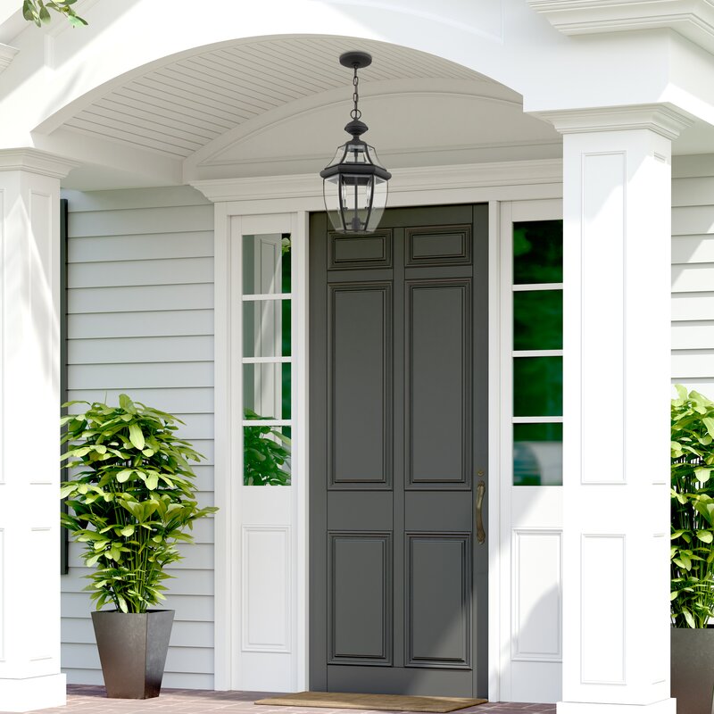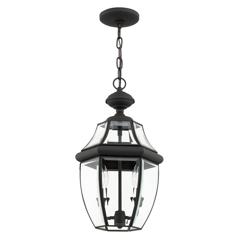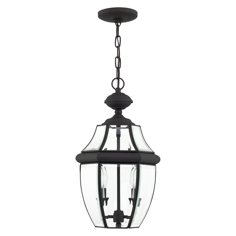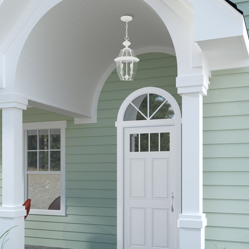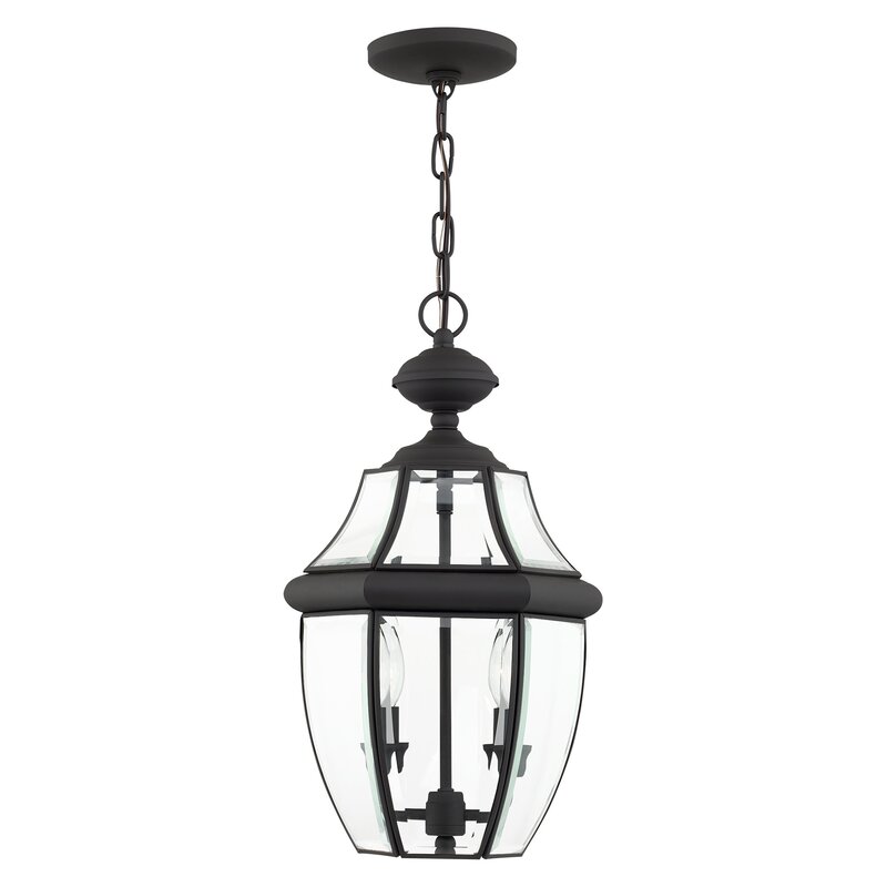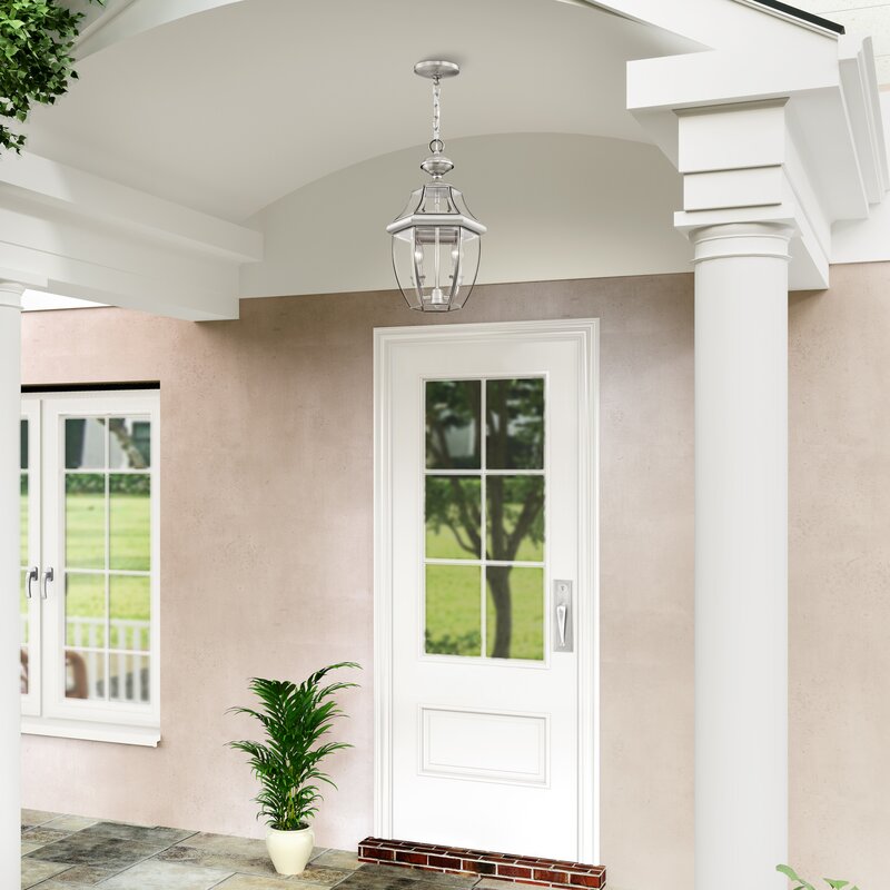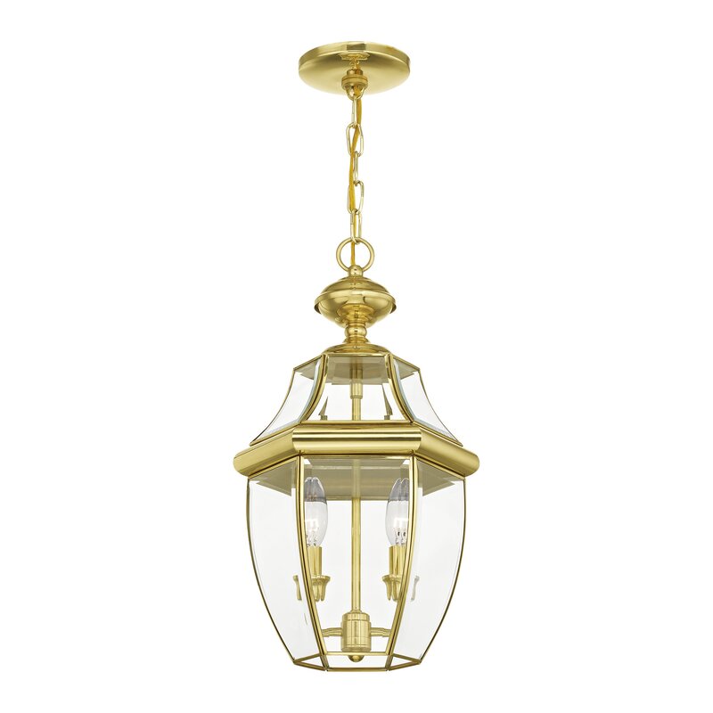 Inspired by colonial gas lanterns hanging from the vestibules of meetinghouses and taverns in sleepy New England villages, and lighting the porches of clapboard-clad homes lining winding cobblestone streets, this traditional two-light outdoor hanging lantern wears its American heritage with pride. Made from solid brass in a handsome metal finish, this chain-hung design showcases a raised canopy, a decorative milled knop, and a traditional candle-style fixture enveloped in clear, beveled glass panels. Establish a timeless, inviting aesthetic on your front porch by setting a planked-top accent table between a pair of spindle-back rocking chairs. Install this handsome design overhead to illuminate the scene in a soft glow, then sit back with your better half and sip on a mug of hot coffee while enjoying the breeze.