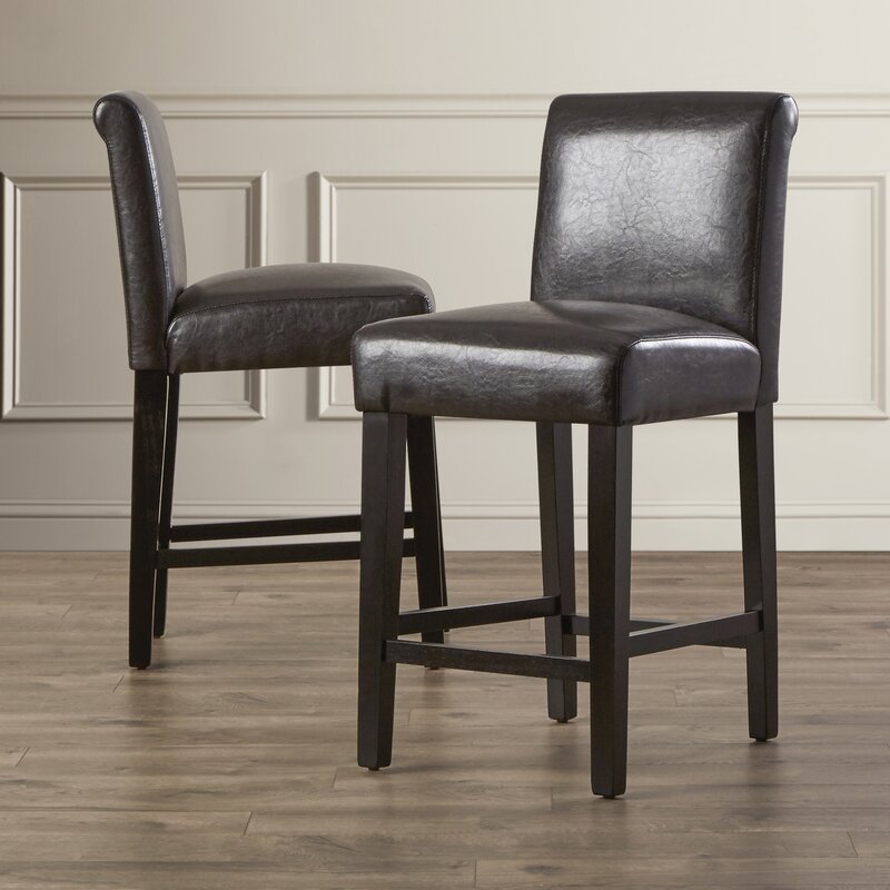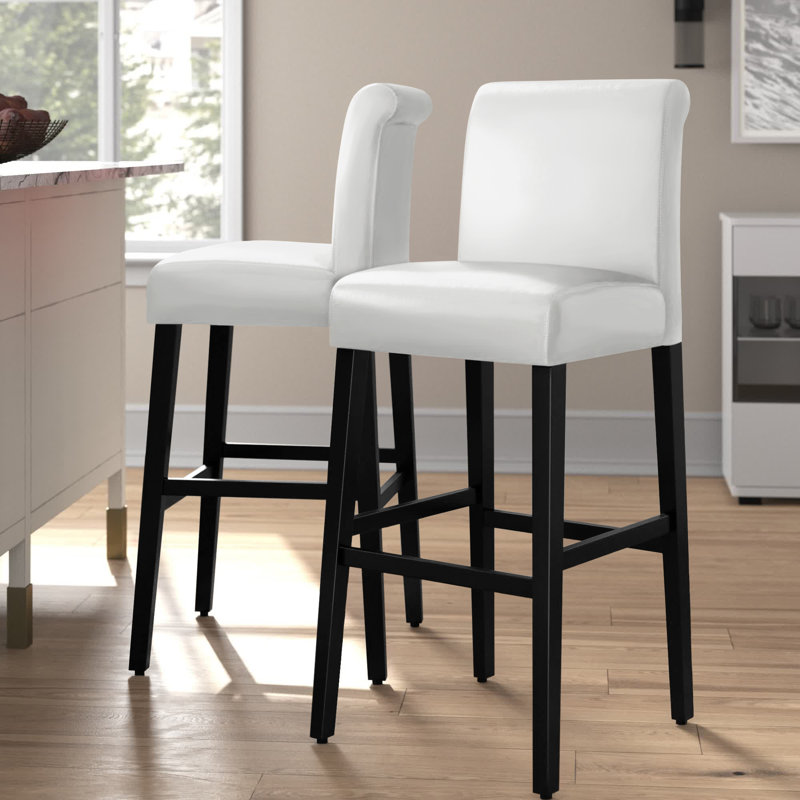 Sidle up to your kitchen island or your home bar with this set of two bar stools, and give your space a traditional feel. Each piece has a solid wood frame with a sleek black finish, and it rests on a 4-leg base with straight legs and a footrest on all sides. The rectangle seat and full back are wrapped in foam-filled faux leather for a little extra cushion as you enjoy your morning cup of coffee or a nightcap before bed. A faintly scrolled top provides the final finishing touch to this set.