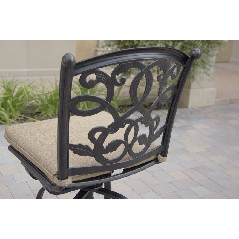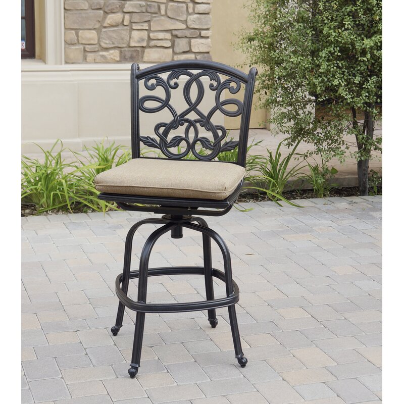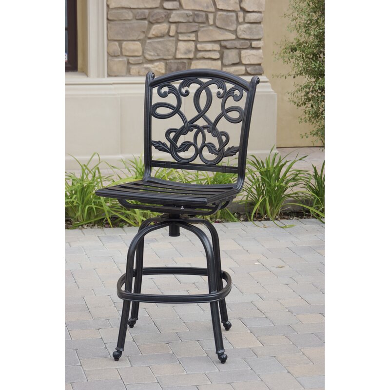 Armless swivel bar stools are cast aluminum with a lattice design seat