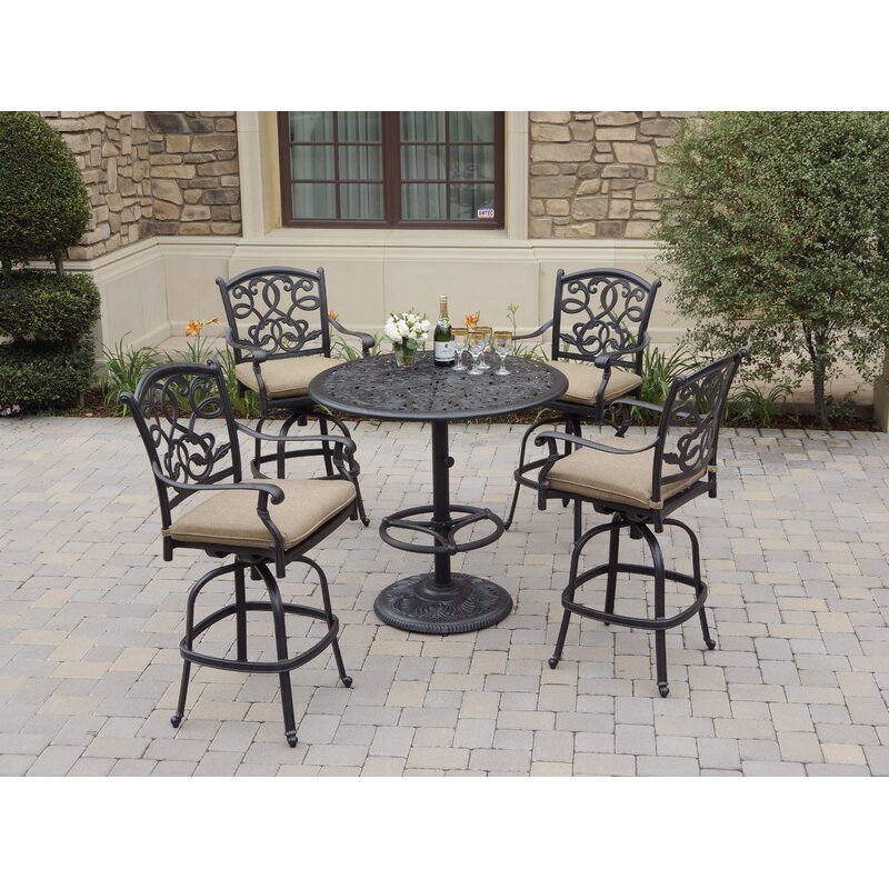 Unwind after a long day of work with this five-piece cast aluminum bar set. This beautiful round pedestal bar table comes with a comfortable footrest and four swivel bar stools. This set embodies both a sense of relaxation and elegance.