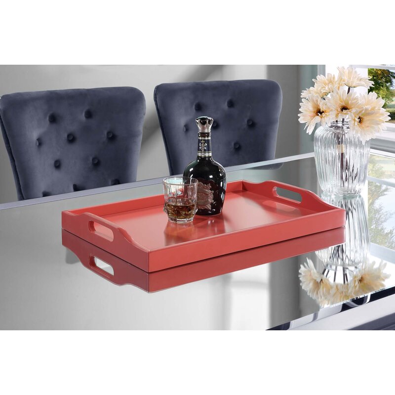 Elevate the display of your ottoman, counter, or coffee table with the Conor Serving Tray. Ideal for serving, eating, working, decorating, organizing, or storing, this multi-functional piece gives endless options for use. This versatile tray can also be used in the kitchen, family room, home office, bedroom, and anywhere else that may come in handy. Available in multiple colorways, this wide and spacious tray will add the perfect splash of color to any room. Use this multi-tasker to highlight your favorite decorative pieces, display them on an ottoman, or serve breakfast in bed. This modern tray is crafted from rubberwood and non-lead-based paint for long-term use. Thanks to the cut-out handles, this lightweight platter is easy to carry and store when needed. The surrounding edges prevent items placed on the tray from falling over. A smooth and sleek surface allows for easy cleaning and maintenance. This serving piece makes for the perfect gift and is conveniently ready for use straight out of the box with no assembly required.