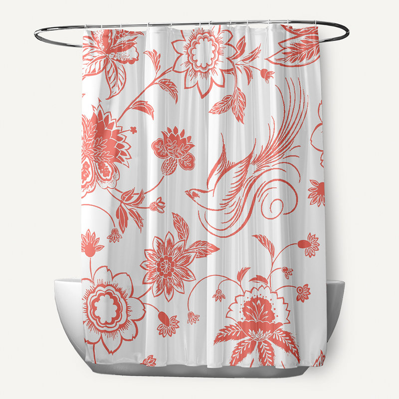 A breathable, flexible alternative to rigid doors, shower curtains bring increased privacy to your bathroom at a budget-friendly price. Plus, they do what doors cannot: wrap around a freestanding bathtub! Add this floral and bird patterned curtain, to your bathroom for a pop of playful design, perfect for a traditional inspired aesthetic. Made in the USA, from polyester, this curtain has 12 hook holes (hooks not included). A liner is required with this shower curtain (not included)