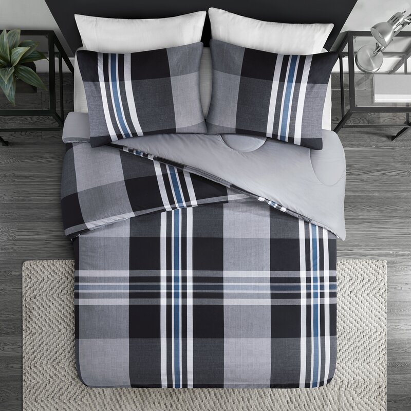 This comforter set refreshes your bedroom or guest room with a classic look and neutral hues. It includes one comforter and two matching pillow shams (one for the twin size), all crafted from 100% cotton percale. The coordinating design features an oversize plaid pattern in black, white, gray, and blue stripe accents for a little color. We love that the comforter has fluffy and hypoallergenic polyfill for a cozy feel. Machine washable and tumble dry-able – wash cold on the delicate cycle and dry with low or no heat for best results.