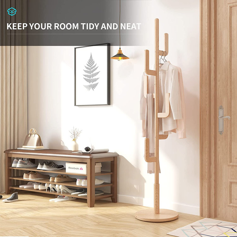 These wood coat rack stands decorate the entryway or hallway, welcome you home, hold heavy coats, jackets, hats, scarves, ties, and handbags and let your days fatigue end up here. And 15.7″ heavy-duty round base and FAS grade 1.4″ thick rod enhance balance, and the entryway coat rack tree isn’t easy to fall over. So we don’t worry about winter coats, or jackets, bearing weights up to 300 lbs. It is made of imported solid rubber wood. High density, durable, stable, and texture are fine & clear. Safe paint, no odor. This wooden coat rack freestanding hall tree will accompany you for many years.6 right angle hooks without burr ensure wor garments won’t slip down or be hooked; Round corner base avoids bumping; 360 full angles hanging; This wood hat rack stand is ideal for children and adults. The hallway rack tree takes up small space in foyers, entryways, living rooms, bedrooms, offices, entry halls, apartments, Gyms, hotels, etc
