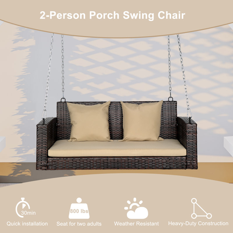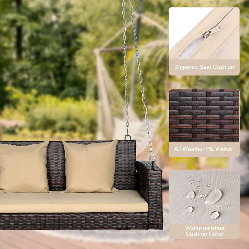 Wide & Cozy Seat: With a spacious dual seat, the porch swing offers enough space for two people to swing and relax. And the swing chair is also equipped with 1 seat cushion and 2 back cushions which provide much softness and comfort. Moreover, the seat cushion is zippered designed so the cover is easy to remove and wash.