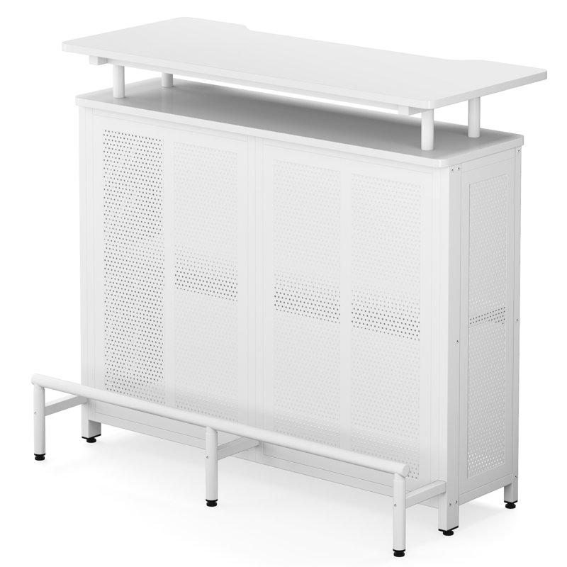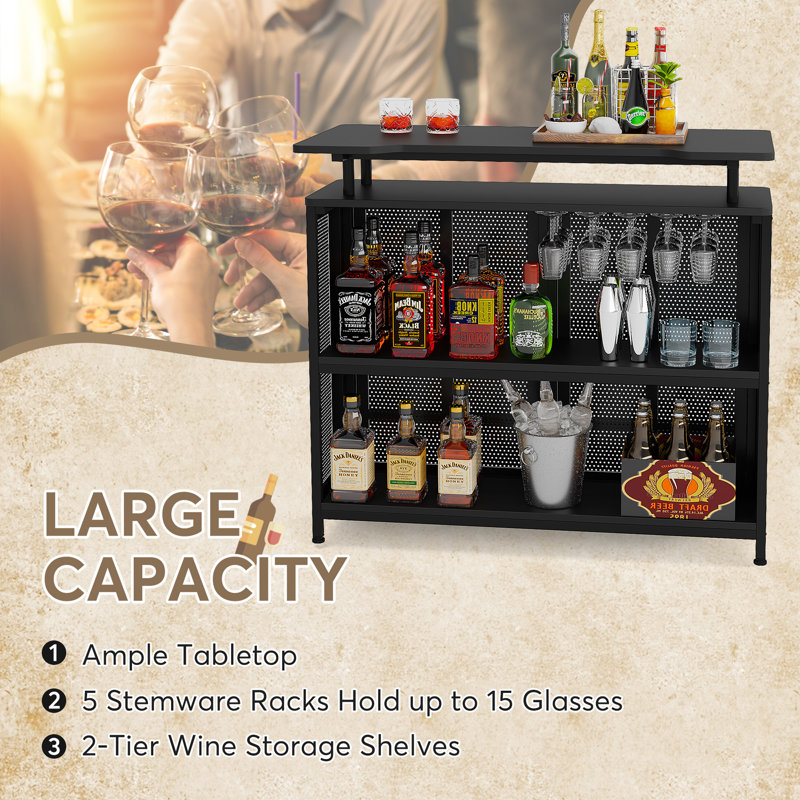 It is a home bar table. Having this, you can invite your friends to come to your home and you can become a bartender making some wines they like and have some fun with them in your home. It is more like a small party. The bar table has 2 ties of shelves inside, where you can put your wines, glasses or other stuff in it. The storage space is big and can hold many wines, liquors champions, etc. The whole body is metal but the shelves are manufactured. This kind of wood is easy to clean and waterproof. When you get some spot or water drop, you can clean it with a wet cloth. The metal is rust-free.