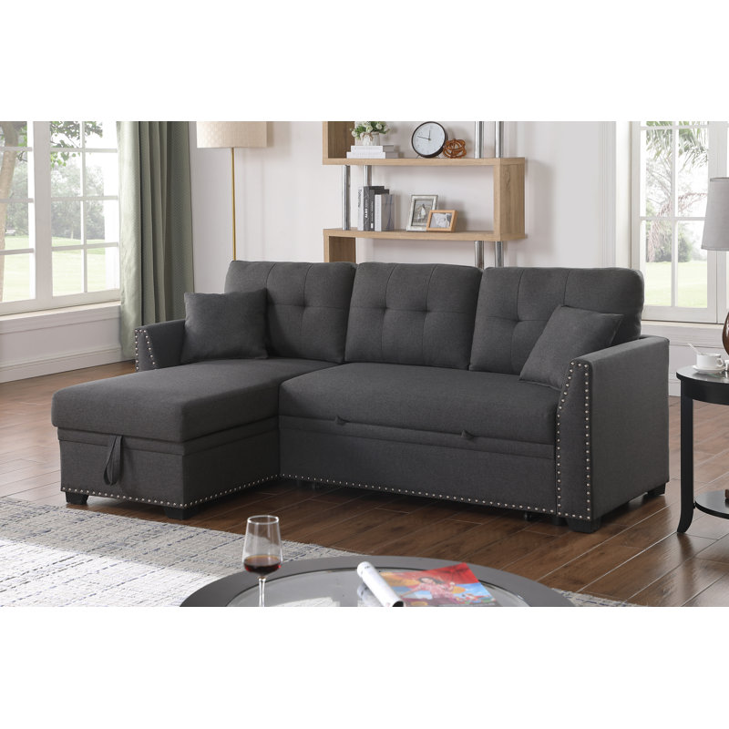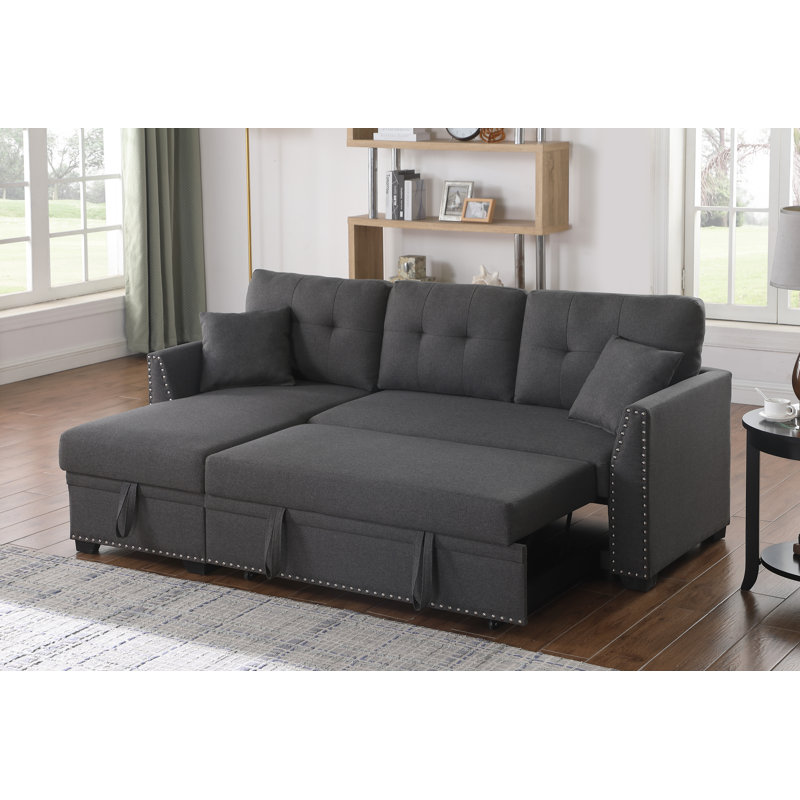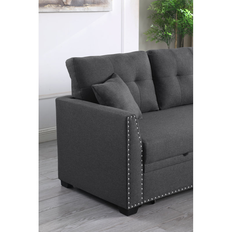 This gorgeous practical living room furniture sectional sleeper sofa is constructed by sturdy wood frame with durable upholstered fabric. Seat cushions are filled with comfortable high-resiliency sponge foam and inner spring for support, and don’t worry about sink in after long time use. Tufted back cushions, clean lines, appropriate height of handrail and silver nailheads decorated along the arms and bottom edge, modern sleek design show your space a trendy lifestyle . This L-shaped sofa with reversible chaise, the chaise lounge portion can be left or right depend on your space and it with a large storage compartment underneath the seat, convenient for storaging living room objects,toys, dolls, books, magazines, snacks, shawls, blankets, etc. A great Comfortable and soft couch with pull out bed, easily quick switch to a bed, will relieve fatigue when lying down enjoy the leisure time, home theater,play games and so on, and also a perfect helper bed couch for guest stay overnight. Perfect size sofa for any small spaces such as compact living room, apartment ,bedroom ,guest room , office spaces.