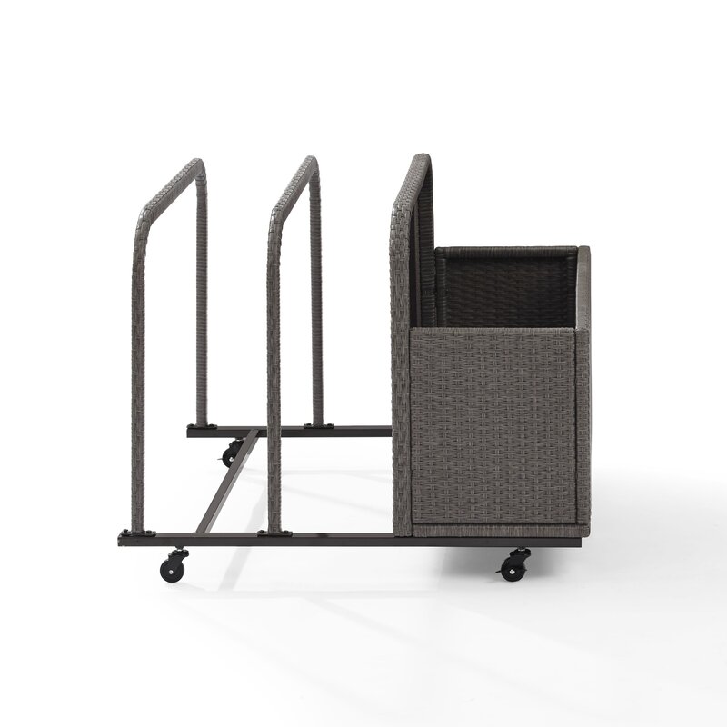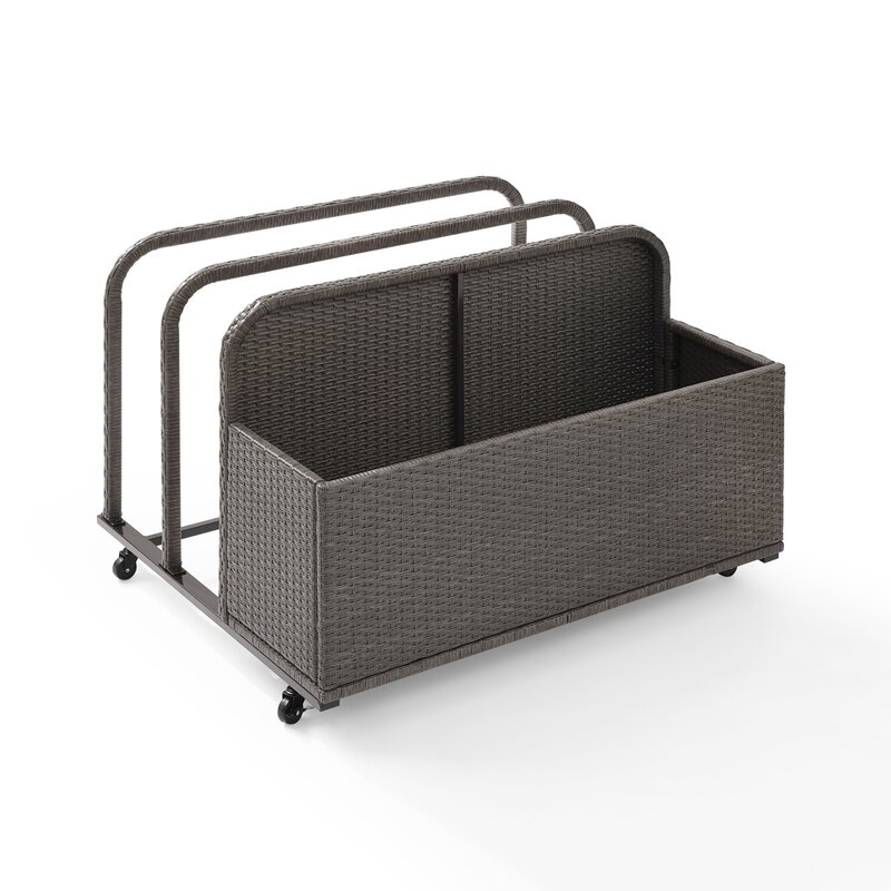 Keep your patio organized and under control with this contemporary outdoor accessories dolly! Founded on a durable steel frame, this dolly features a wide rectangular frame on lockable wheels for effortless mobility, while two resin wicker-wrapped bars keep everything from floats to cushions, to folded tables corralled. Rounding out the design, a large wicker basket is perfect for housing pillows, pool toys, and more.