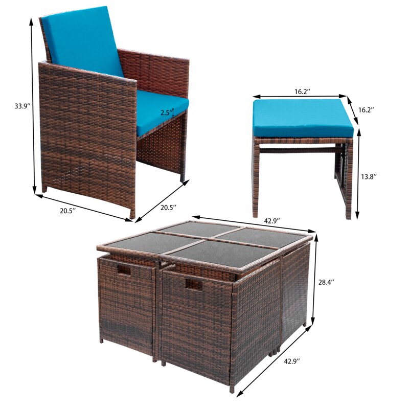 Agra Square 8 – Person 42.9″ Long Dining Set with Cushions including 1 piece of table, 4 pieces of single chairs, 4 pieces of ottomans, and 12 pieces of cushions. This product is made of high-quality waterproof rattan with high-density thick sponge cushions to provide you with a good sitting experience. You can pull out the chair when you need it and the fully opened state can provide 8 people to sit. When you do not need to use it, you can completely close it up, which can save a lot of space.