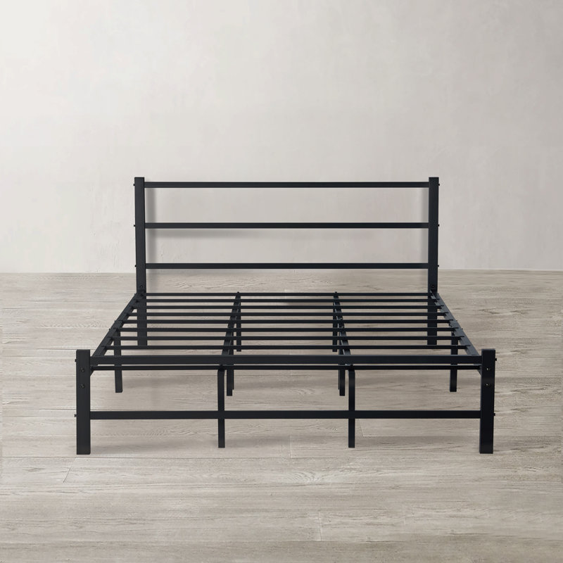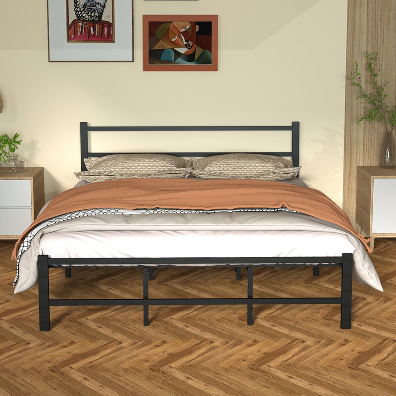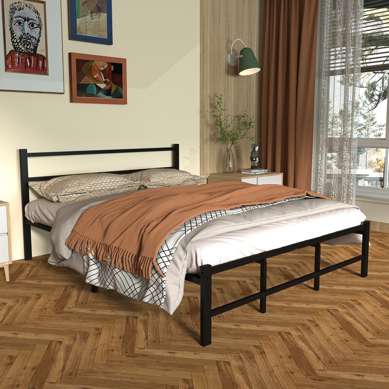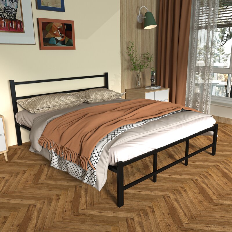 The black metal bed frame has a simple and stable look that will complement any color scheme. This modern metal bed frame is a sleek finishing touch to your bedroom. Strong black bars run horizontally as the headboard. This metal bed frame is made of heavy-duty steel slats to provide optimum support for your mattress, preventing sagging and increasing its useful life. It is efficiently designed and constructed to eliminate the need for a box spring.