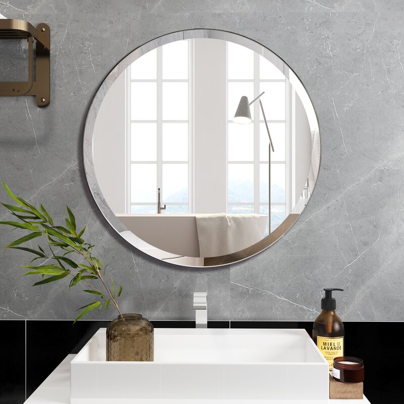 Beautifully designed: The sleek glass design is characterized by its beveled design and circular outline, anchoring any wall in a bold style. Add this mirror to your master bedroom powder room to complement the clean and uncluttered setup.