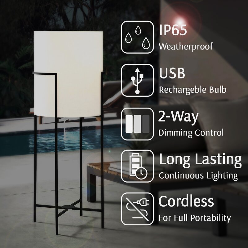 Take your indoor style to your outdoor living spaces with this modern cordless LED outdoor floor lamp. Weatherproof material and UV-resistant shade protect this lamp from rain, wind, and sunlight.
