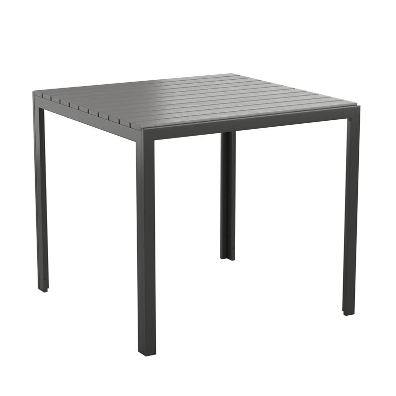 Complete an indoor or outdoor oasis in your home or business with this commercial grade steel framed patio table with a poly resin slatted top. This dining table comfortably seats up to 4 adults and coordinates perfectly with almost any seating. The steel frame of this all-weather table will not rust and boasts fixed floor glides to prevent damage to indoor flooring surfaces. The slatted top won’t rot, chip, or peel making it ideal for year-round use at your bistro, hotel pool, or on the deck at home. Assembly takes less than 10 minutes with the included tools and instructions and cleanup is quick and easy with a damp cloth.