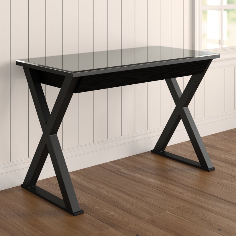 Whether you are working on your laptop or writing thank you notes to family and friends you’ll love the ample workspace of this desk. The contemporary-inspired frame with X legs, a neutral finish, and a glass top, makes it perfect at home in a traditional aesthetic. With one drawer at the center, you can store pens and papers at arm’s reach.