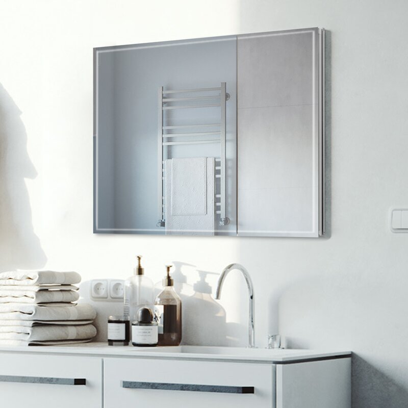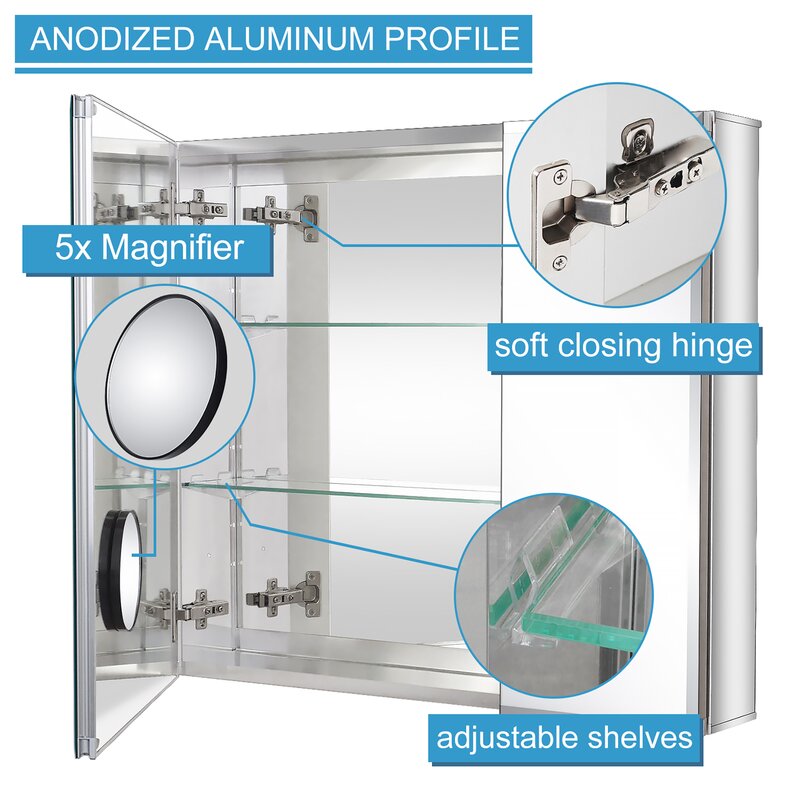 Beveled edge mirror in front, and with mirror on the back of the door and interior back of the cabinet. Equipped with removable 5X magnifying makeup mirror, adjustable tempered glass shelves, and soft closing hinge.