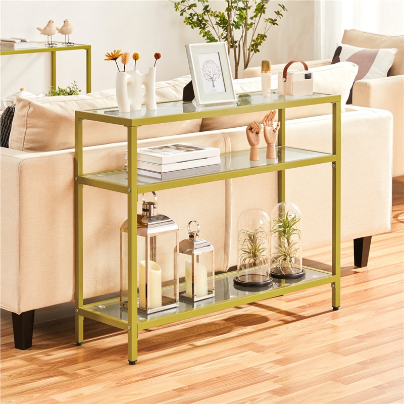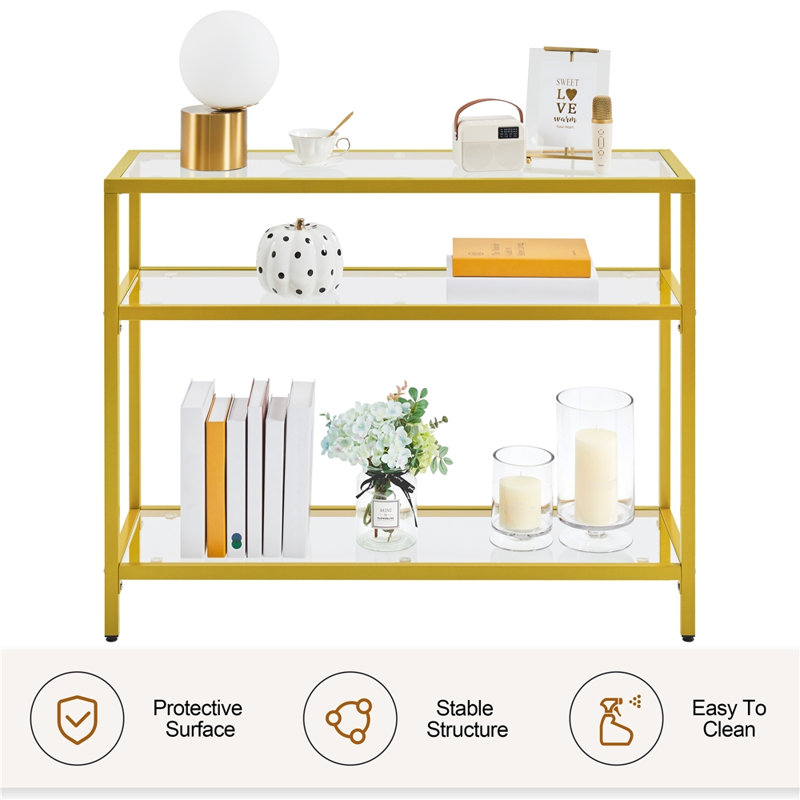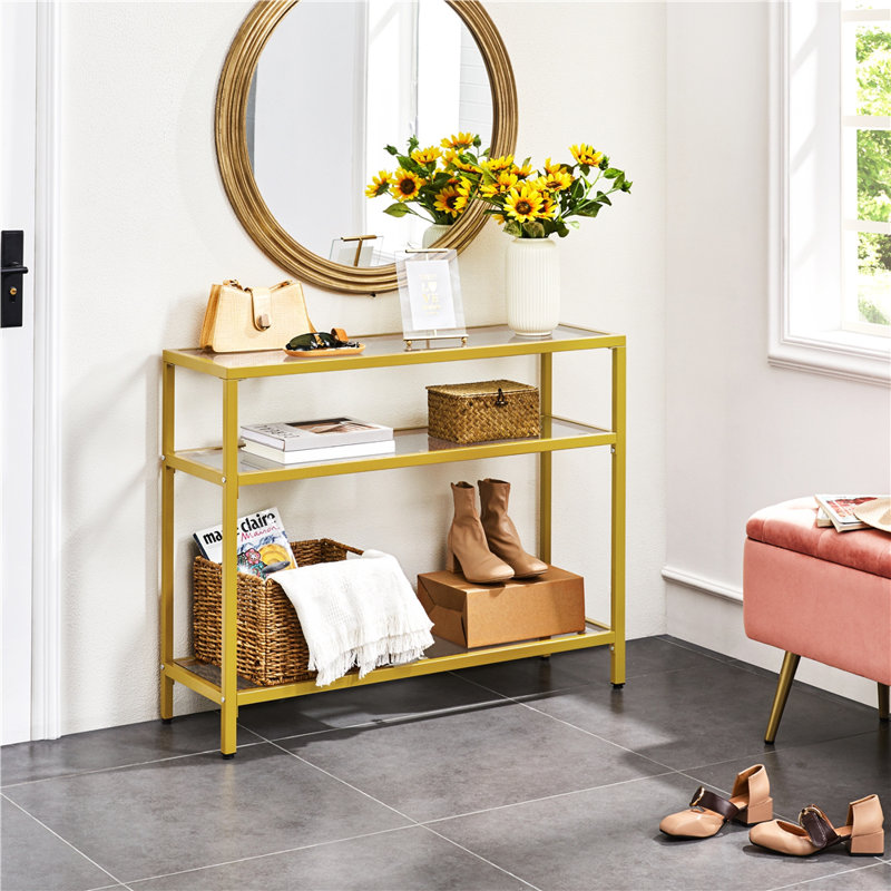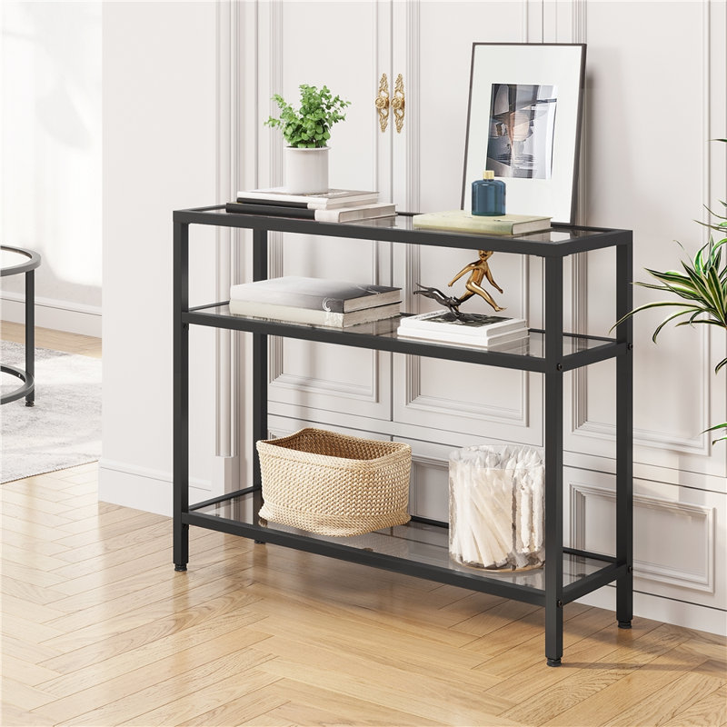 Looking for a delicate console table but are lost in the various styles and materials? With this tempered glass, one can never go wrong. Crafted with strong tempered glass and a protective coating covered iron, this porch table boasts great durability, stability, and weight capacity. You can also apply it in your study to work as your bookshelf, in your kitchen to serve your delicate dishes, or by your sofa to accommodate the stuff you need at hand. With classic color, simple lines, and transparent texture, this 3-layer console table can easily integrate into your room decors to serve as an elegant but practical addition to your tasteful space.