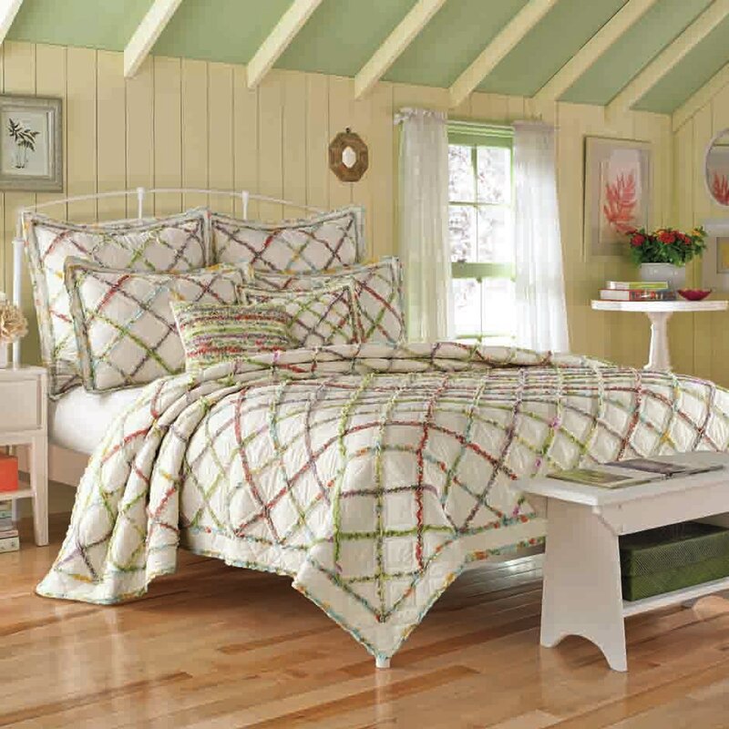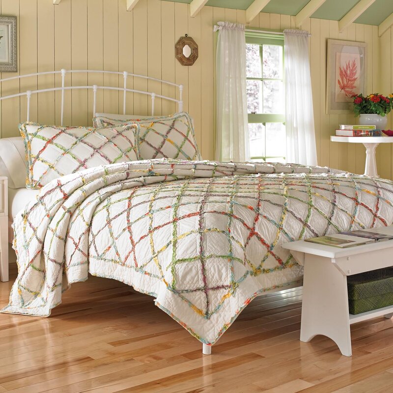 This Reversible Quilt features bands of appliqued ruffles that form a trellis pattern layered on an ivory ground. Features diamond quilt stitch.