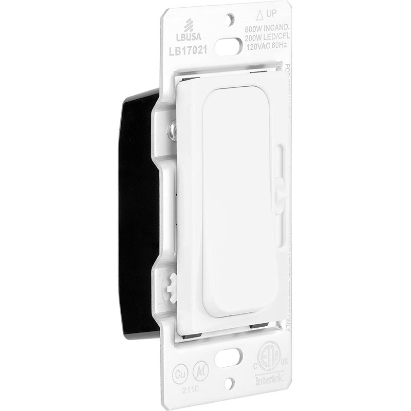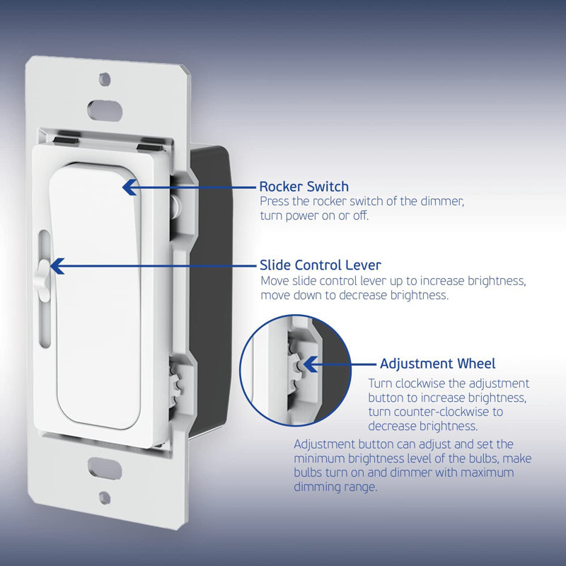 Wall Dimmer Switch with Dimmable Slide: Our Wall Dimmer Switch with Dimmable Slide is compatible with up to 200 Watts of dimmable LED/CFL bulbs and up to 600 Watts of incandescent and halogen lamps. Press the rocker switch of the dimmer, turn power on or off. Move the slide control lever up to increase brightness, move down to decrease brightness. It doesn’t get easier than that! For your safety, this fixture is ETL certified.
