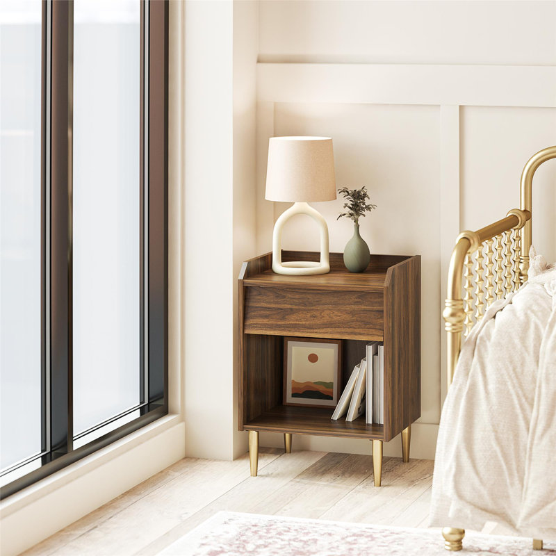 The Remy nightstand features a vintage-style shingle drawer front, hidden drawer pull, and tapered brassy gold legs for a sleek polished look both you and your child will cherish
