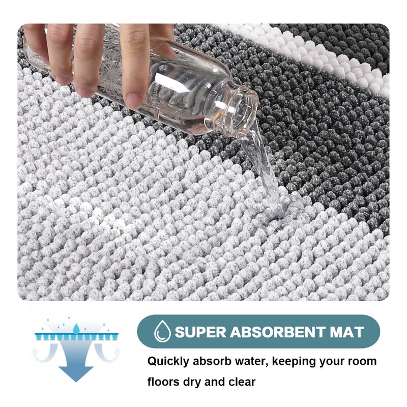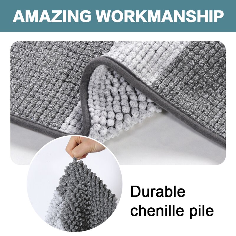 Super soft and fluffy: The chenille fabric microfiber bathroom rug features extra thick quality, it is designed to quickly absorb water, keeping your bathroom floors dry and clear, with no mildew or odor from this rug.