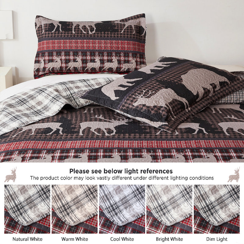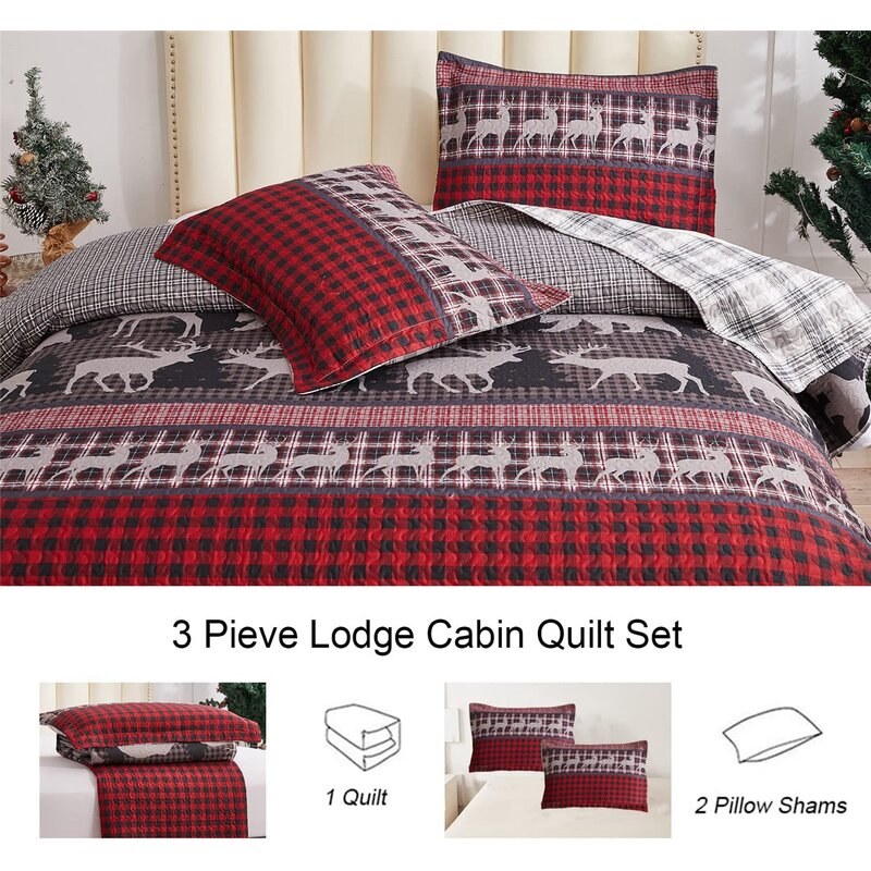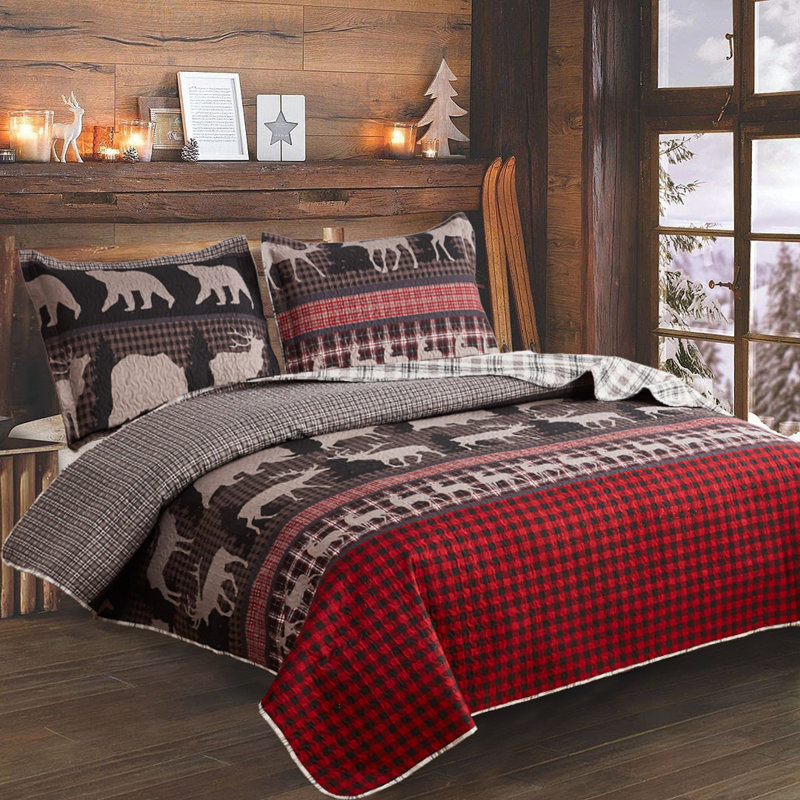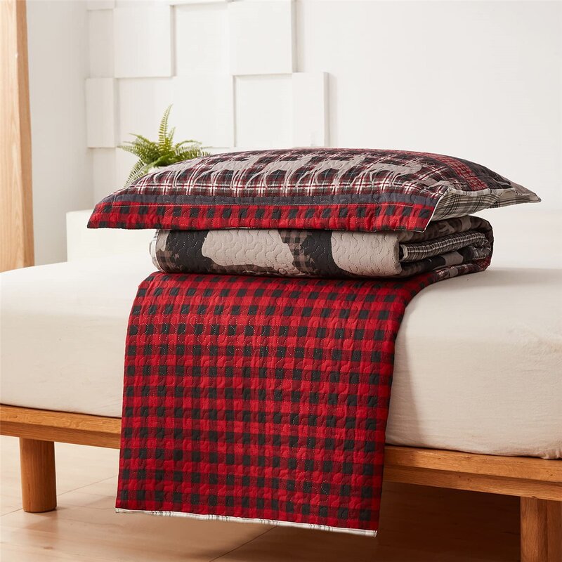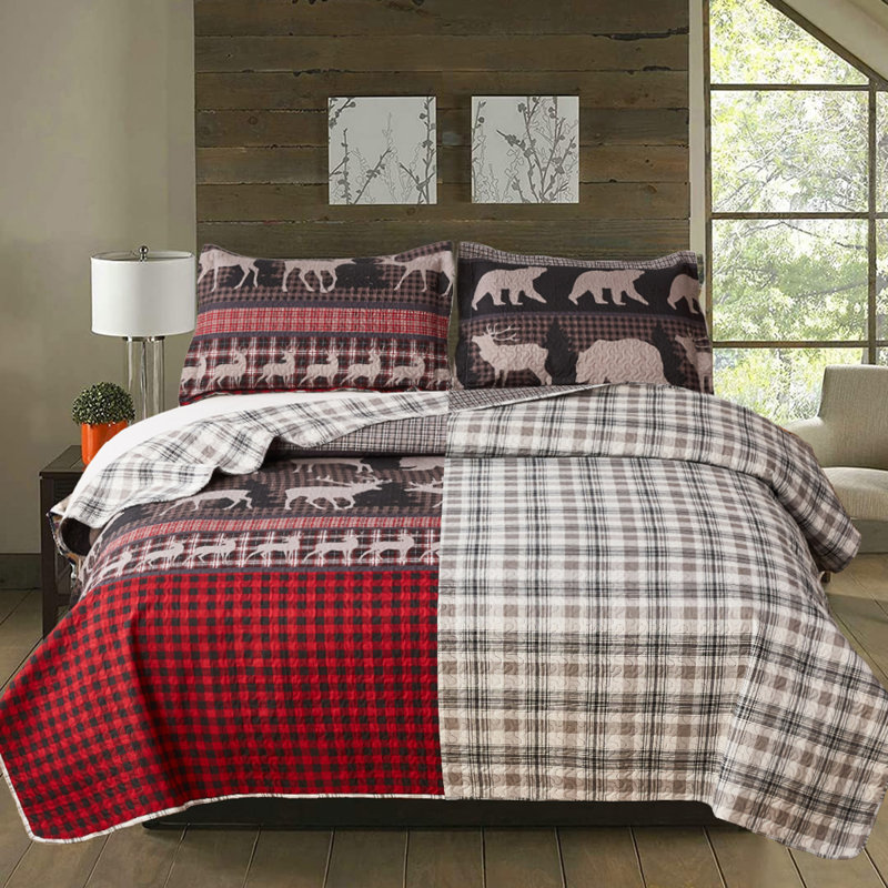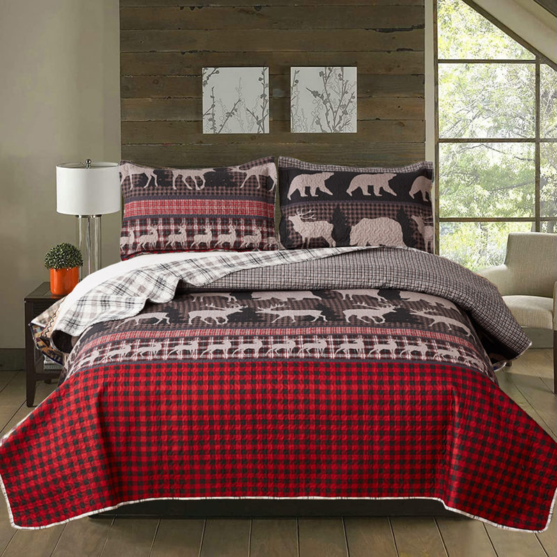 These moose bear burgundy plaid bedspread looks extravagant for high-class society, it is a good gift to exchange among them. People may benefit from the warmth the material provides naturally, quite healthy for our skin.