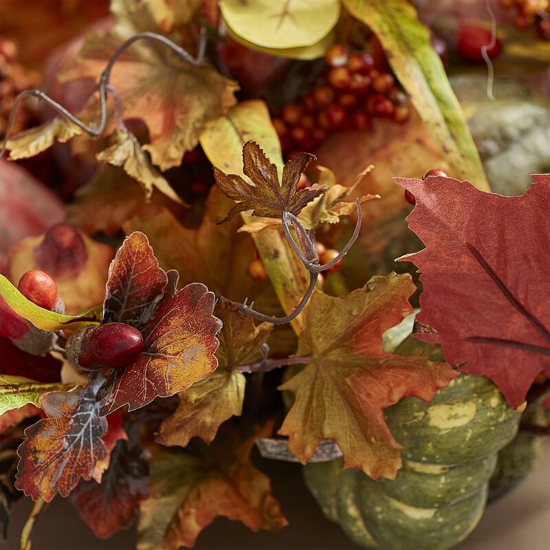 Anchor your holiday tablescape in the dining room or lend a bold touch to weeknight dinners with this charming centerpiece, featuring clusters of autumn leaves, gourds, and grapes.
