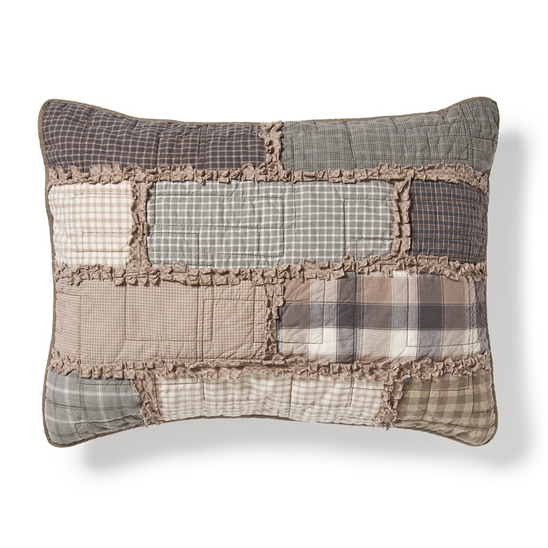 This stylish Sham features a series of soft plaids in neutral colors taupe, ivory, slate and dove grey. Arranged in large offset panels with ragged edges.